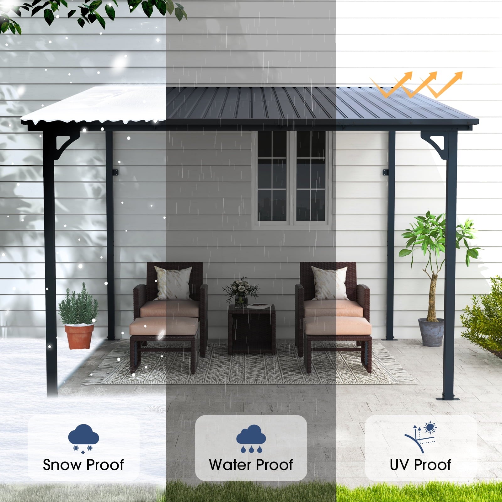• Wall-Mounted Design – Wall-mounted heavy hardtop pergolas are suitable for installation on the side of a house, on a patio, along a porch,  or for use next to a wall. Effectively blocking ultraviolet rays, it is a perfect choice for outdoor barbecue, party, or daily relaxation with your family and friends all year round.