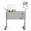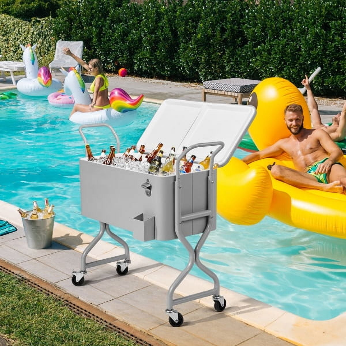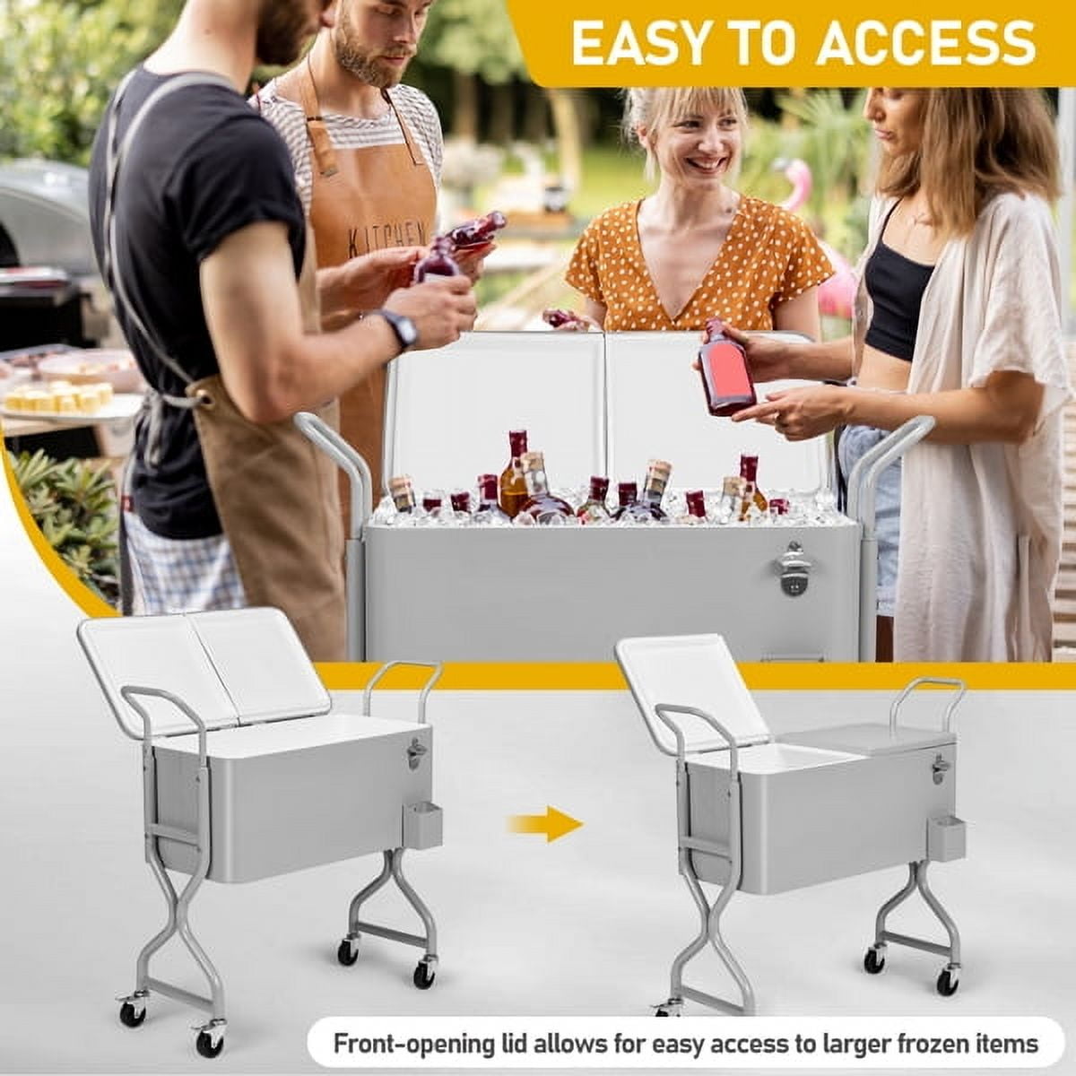 Level up your outdoor events with an all-in-one cooler cart! Fit all the cool refreshments you need with a large, 80-quart fill capacity, and the lower shelf provides extra space for extra beverages or other items you wish to store. Its insulated basin keeps your beverages cold for multiple hours with its injected molded insulation technology. The bottle opener and cap catcher help you easily remove and collect the caps, and the sturdy wheels provide easy mobility when the cooler is full with its locking casters. The drainage cap make it so convenient to clean up the cooler in a nap. Entertain yourself and your guests with this beautiful and high-quality rolling cooler cart!