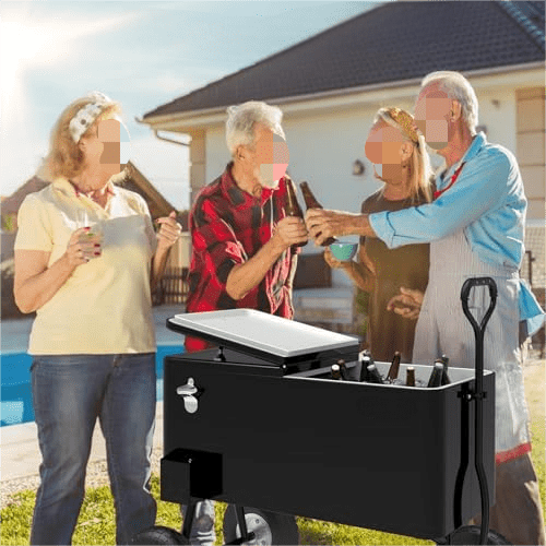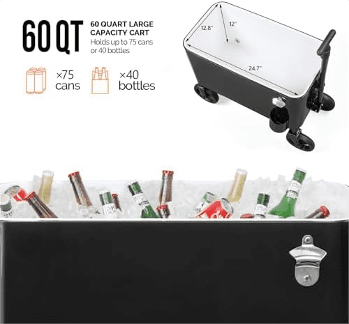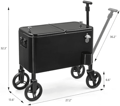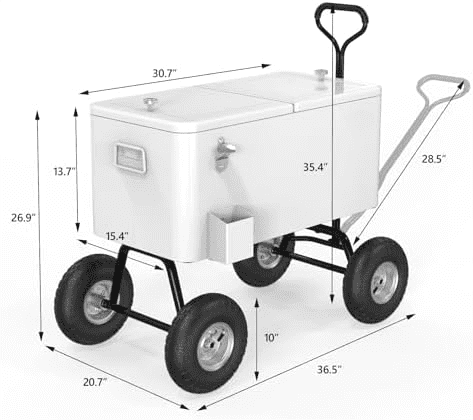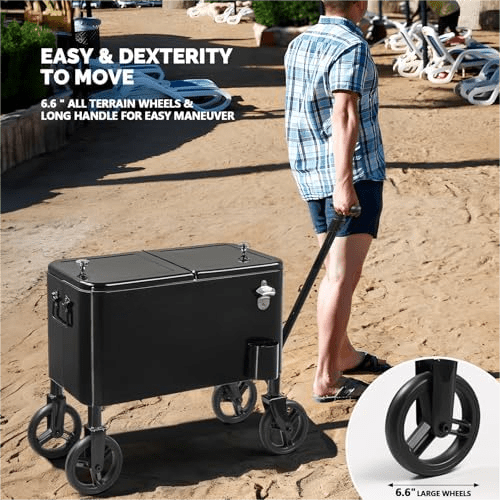 EASY & DEXTERITY TO MOVE: . This outdoor cooler on wheels features four large 10″ inflatable all 4 terrain wheels for use in the yard and beach. Plus, its long handle makes it very easy to maneuver around on most outdoor condition