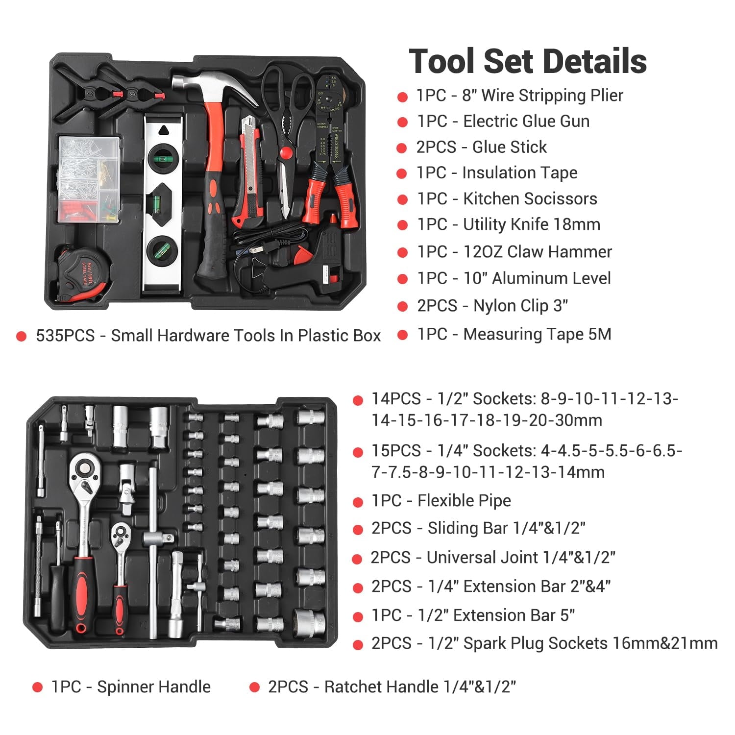 - 800 Piece Tool Sets: This 800-piece tool set includes a variety of essential tools such as wrenches, screwdrivers, rulers, hammers, and universal joints, along with extra tool ties and kits. It is designed to address all your daily needs, making tasks simpler and more efficient.