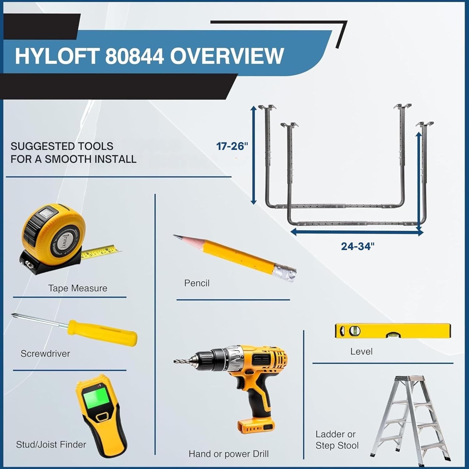Maximize garage space efficiently with this ceiling storage for garage to free up valuable floor space. Ideal for bins, luggage, and bulky items with over 30 cubic feet of storage capacity. hanging garage storage rack built with heavy-duty, powder-coated steel for durability and long-lasting performance. Versatile ceiling storage solution that fits most joist configurations, with a height range from 17 to 26 inches, and width from 24 to 34 inches, making it adaptable to various garage setups. Heavy-duty garage storage racks that can store up to 250 pounds of evenly distributed weight, perfect for ladders, kayaks, seasonal items, sports gear, and more. Comprehensive garage organization system that enhances your garage organization and storage with an easy-to-install garage shelving heavy duty system, featuring all necessary hardware for a hassle-free setup.