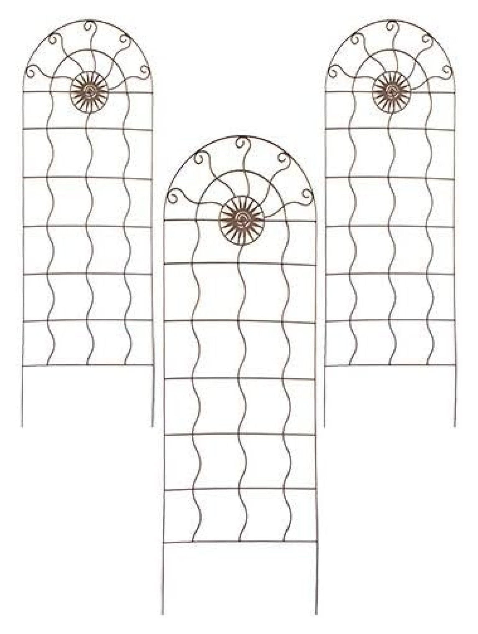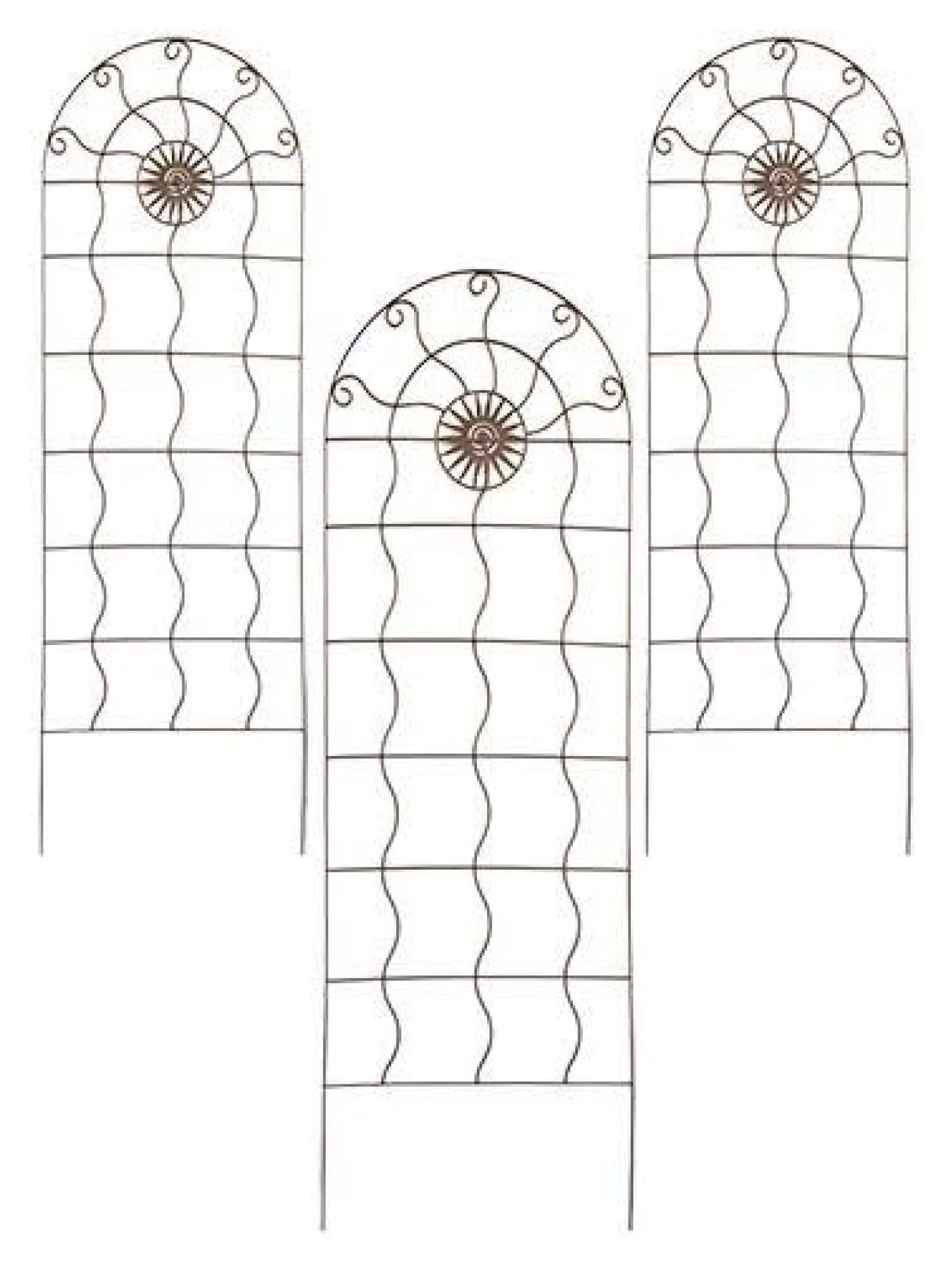 Turn your garden into an artistic retreat with the 84442 Aztec Sun Garden Trellises, Rust – 72″ H, Pack of 3. These trellises blend form and function, offering stylish vertical support for climbing plants while acting as bold visual accents. The arched tops, curved inner rails, and central sun medallion echo ancient Aztec designs, bringing a distinctive flair to any outdoor space. Each trellis stands a striking 72 inches tall and 24 inches wide, with strong metal construction and a rust-hued powder coat that weathers beautifully over time. The -shaped vertical rods and curling upper rails mimic sunrays, making these trellises true sculptural in your landscaping. Install all three in a row to define a garden border or place them individually around your space to continuity and support for plants. The long, spiked legs easily anchor the trellises in soil, providing secure installation without extra . Whether supporting flowering vines or simply elevating your garden design, these trellises bring timeless, thematic style and reliable performance. Product Specifications: Dimensions: 24″W x 72″H each Rail Dimensions: 0.25″ dia. round rails Mounting: In-ground with 11.75″ legs Material: Welded steel Color: Rust brown Style: Aztec sunburst, arched top Quantity: Pack of 3 trellises
