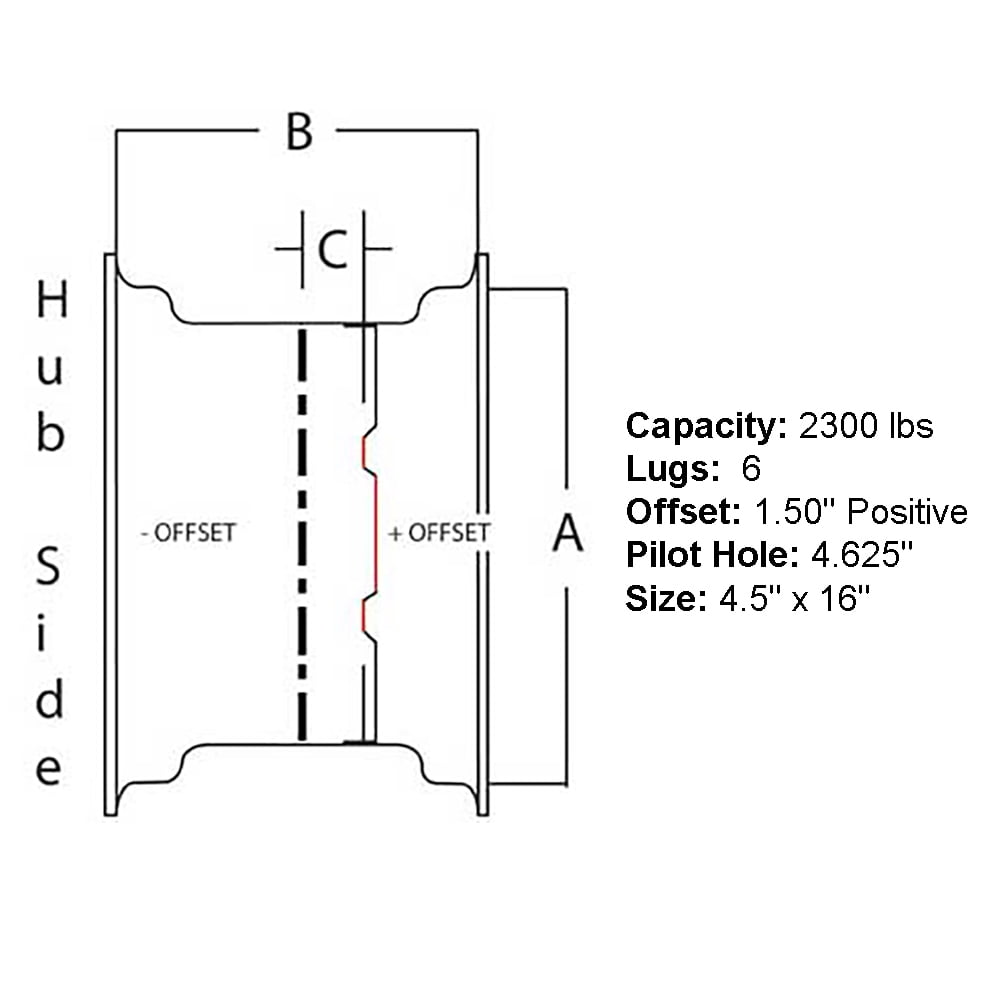 - Size: 4.5″ x 16″ — Offset: 1.50″ Positive — Pilot Hole: 4.625″
