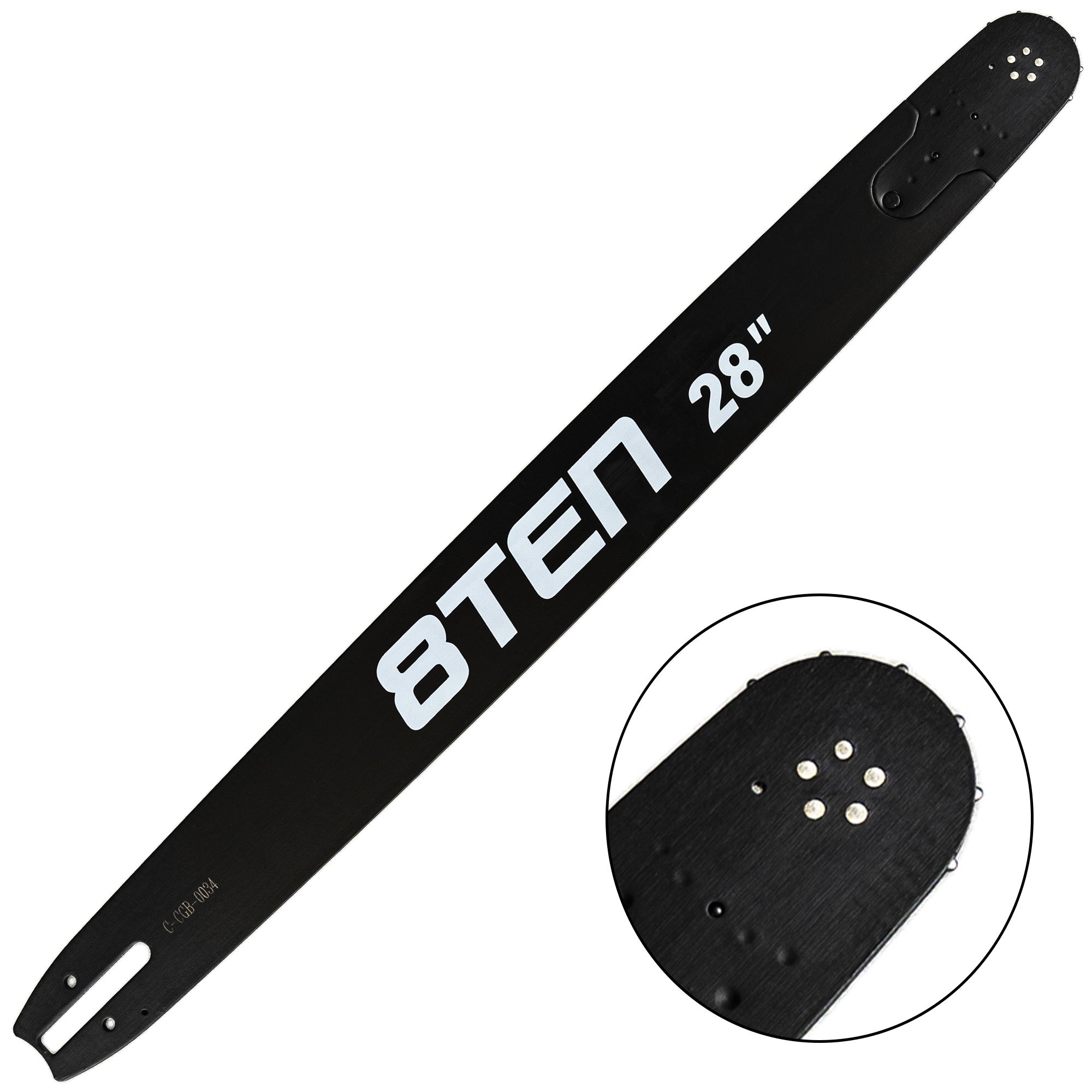8TEN Chainsaw Bar Cutting Length: 28″; Gauge: .050″; Pitch: .375″ (3/8″); Drive Link Count: 91; Bar Type: Solid; Guide Bar Material: 50CrV4; Nose Sprocket Material: 68CrNiMo
