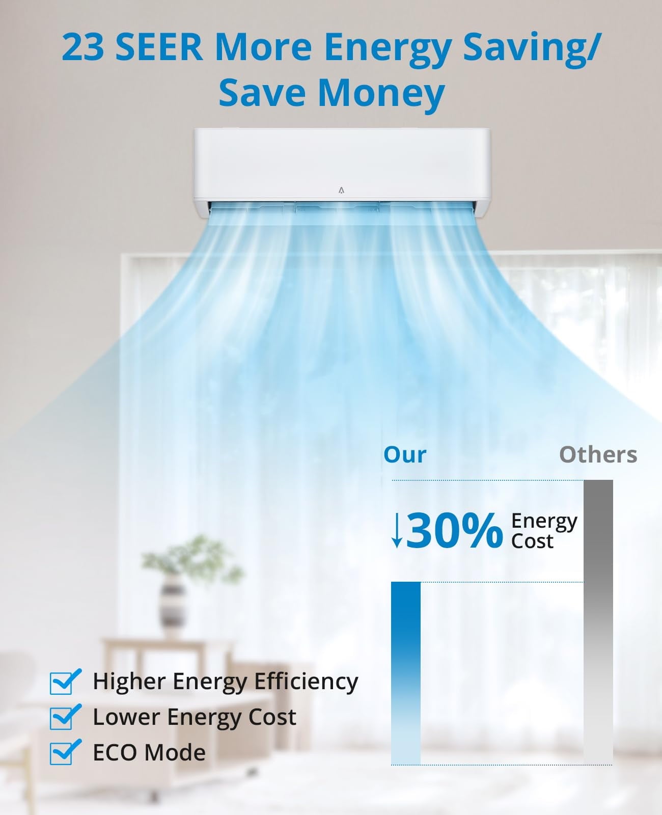 - Energy-Efficient Operation: Featuring an impressive 23 SEER2 rating, this inverter-driven mini split reduces energy consumption while maintaining optimal performance, helping lower your utility bills.