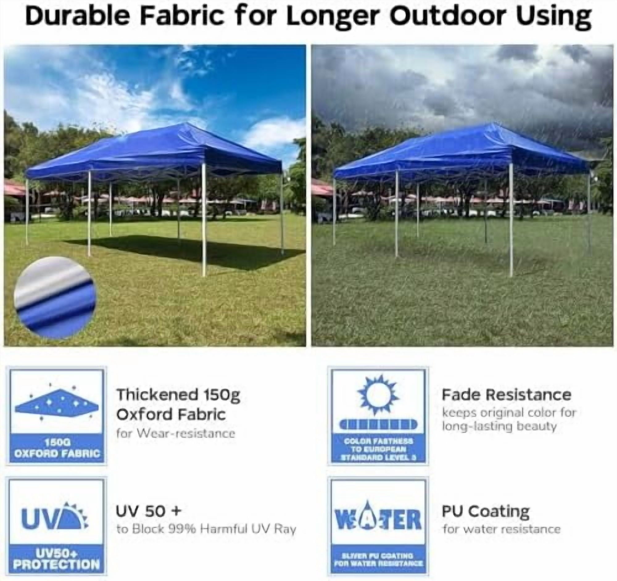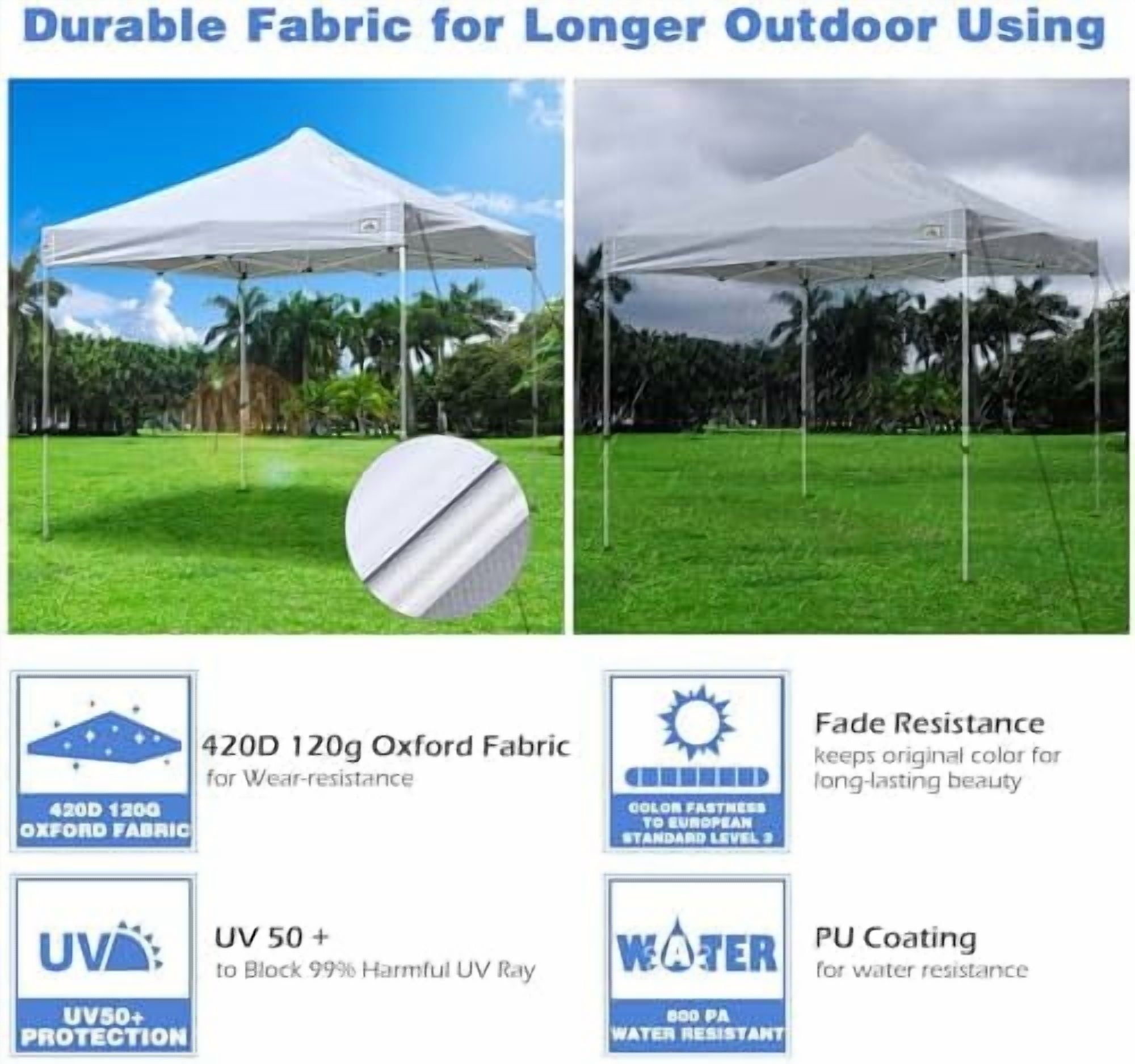 [Durable Material & Stable Construction]: 420D 120g Oxford fabric with dual-knitting, compared to traditional knitting, features better wear resistance for long life span; Water-resistance for drizzling days; D-rings on corner for easily attaching ropes with stakes to enhance stability; Air vent design on the top for better ventilation, keeping steady even in windy days