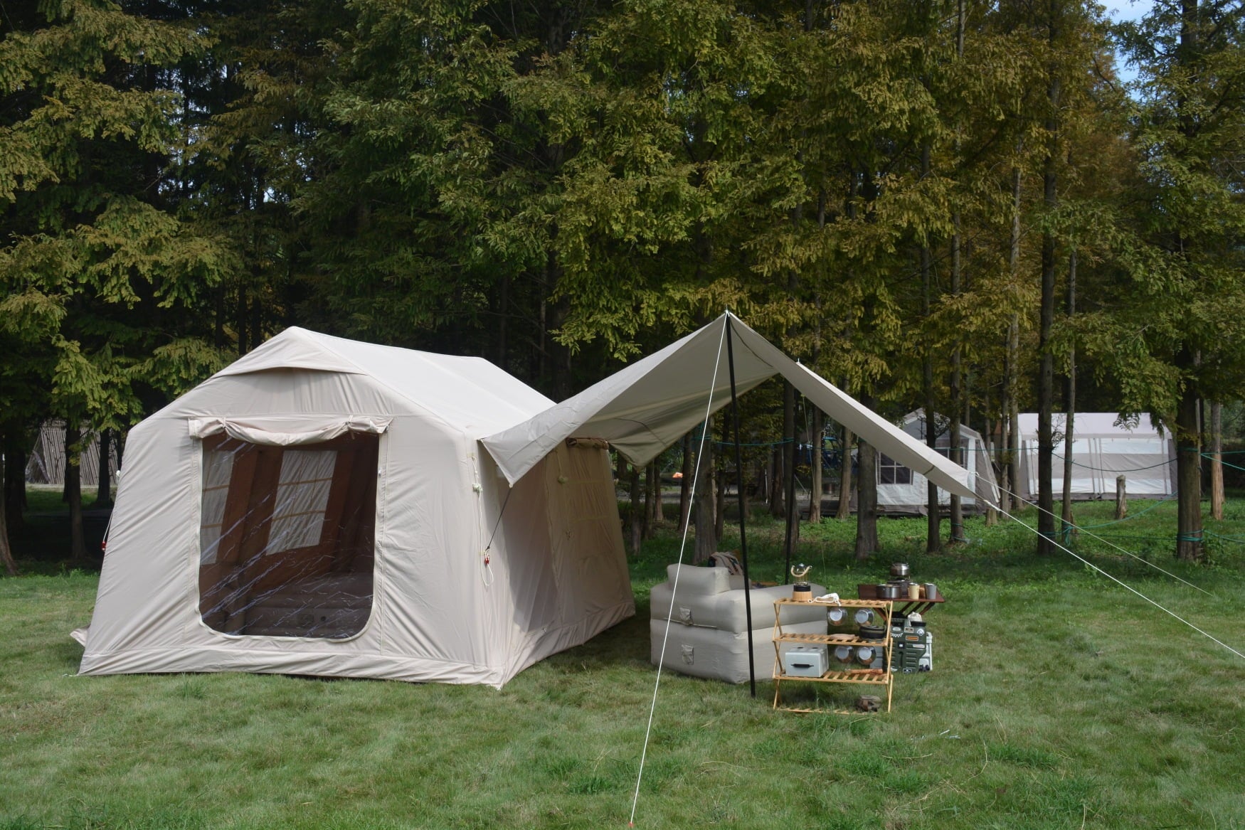 This 9.8ft x13ft inflatable camping tent with a canopy is designed to elevate outdoor experiences, whether for family trips or glamping getaways. Its spacious interior comfortably fits 7-8 people—enough for 4 to sleep and a group to gather for meals or games. The 300D polyester fabric feels soft yet sturdy, resisting wrinkles and withstanding wind, while the waterproof PU3000mm coating keeps rain out, ensuring dryness during unexpected showers.