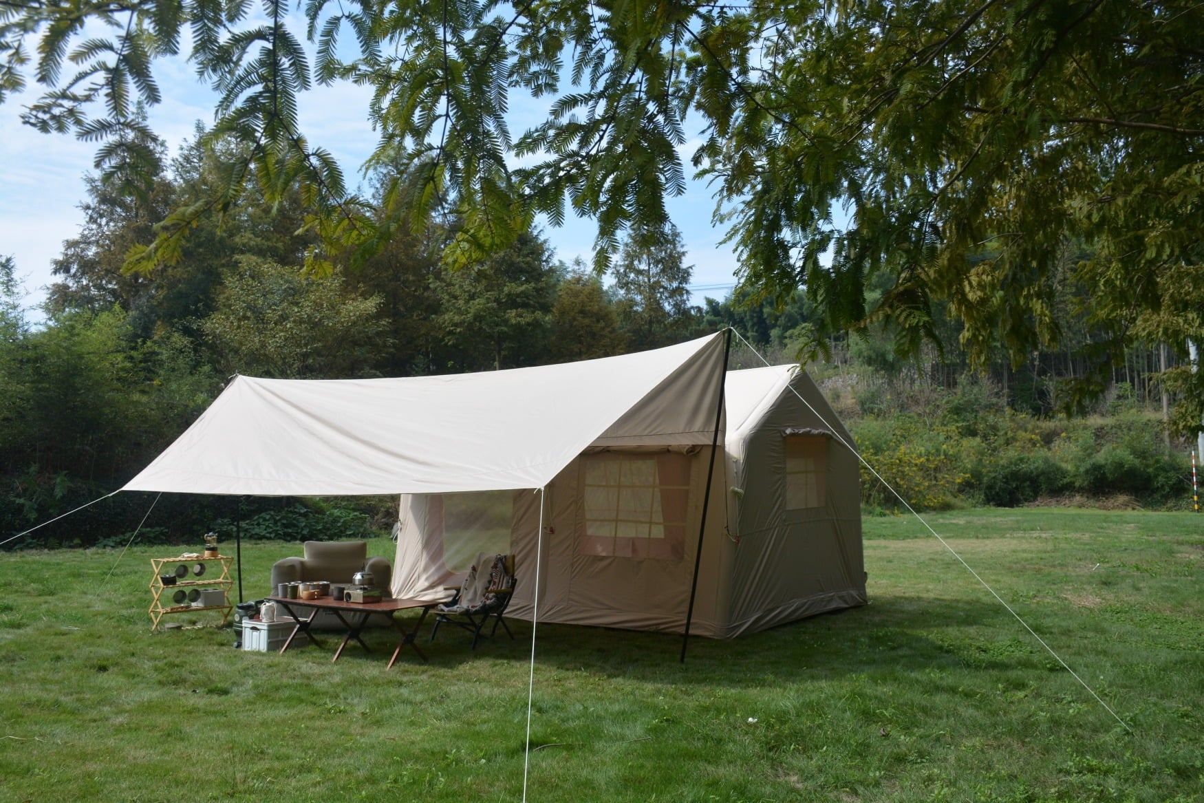 • [300D Fabric for Durable Comfort] This tent is made of 300D feel cotton full elastic polyester fabric, offering a soft hand feel and wrinkle resistance. The sturdy material withstands daily wear, while its texture enhances comfort during stays. Paired with a windproof design, it maintains stability in outdoor conditions, ensuring long-term use in various camping environments.