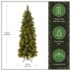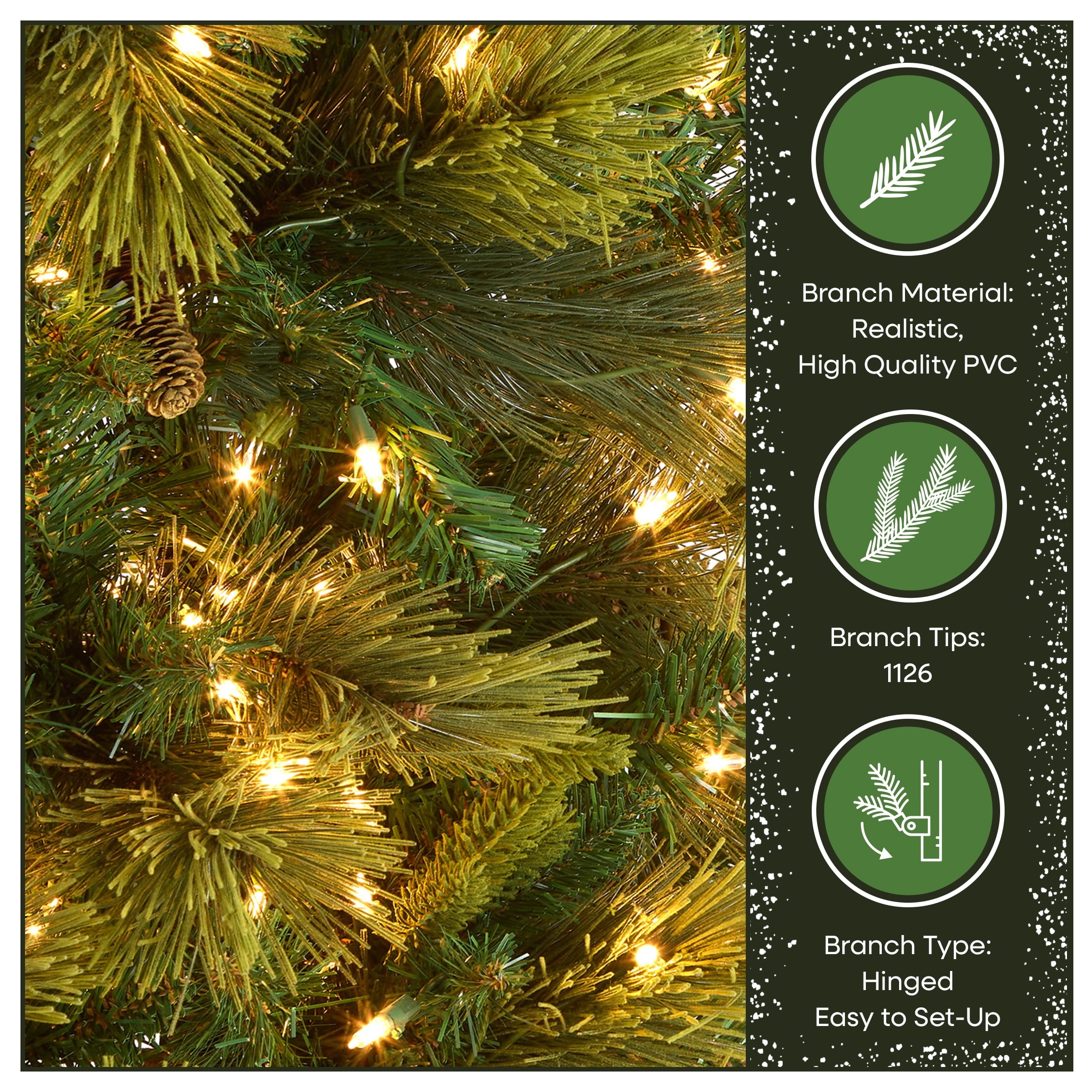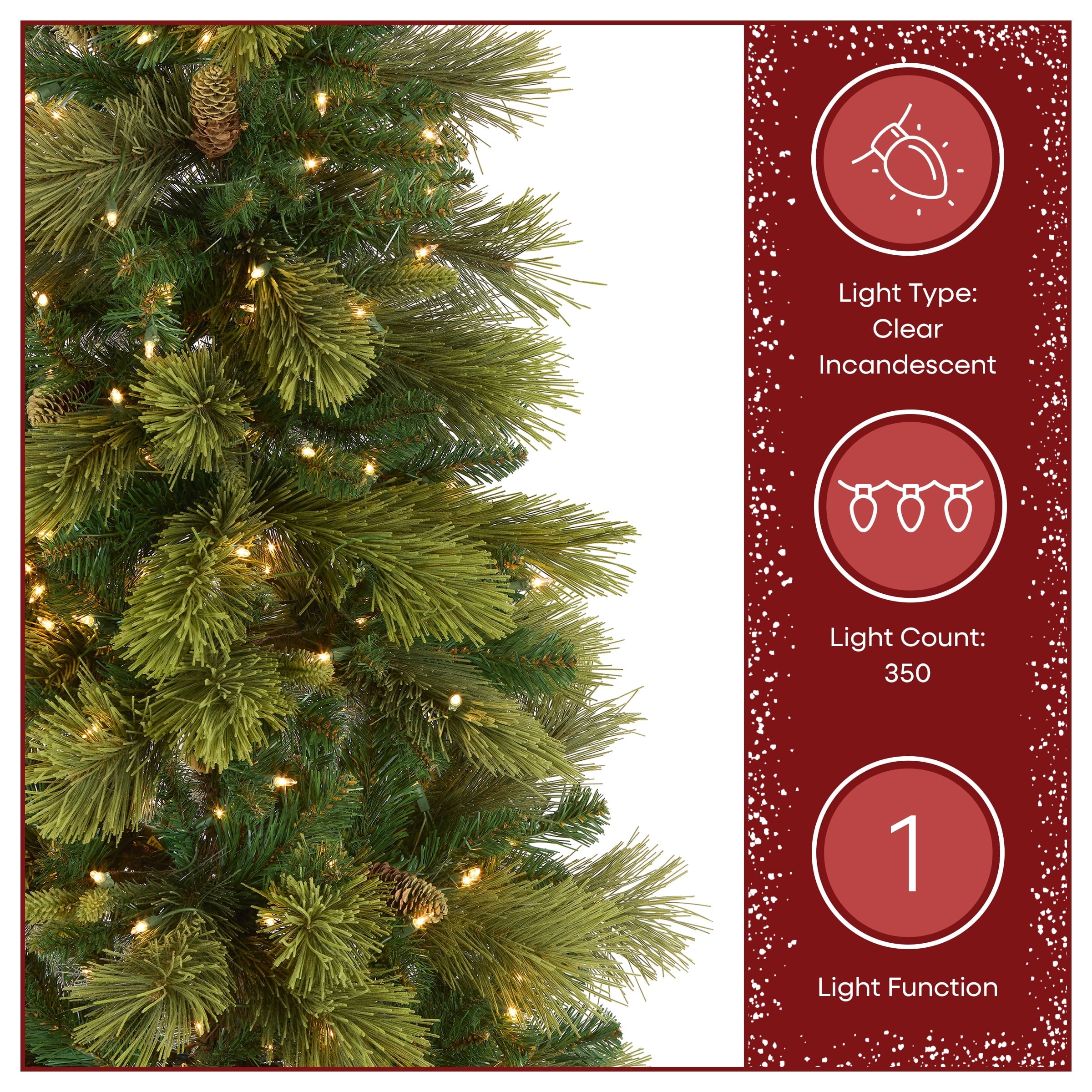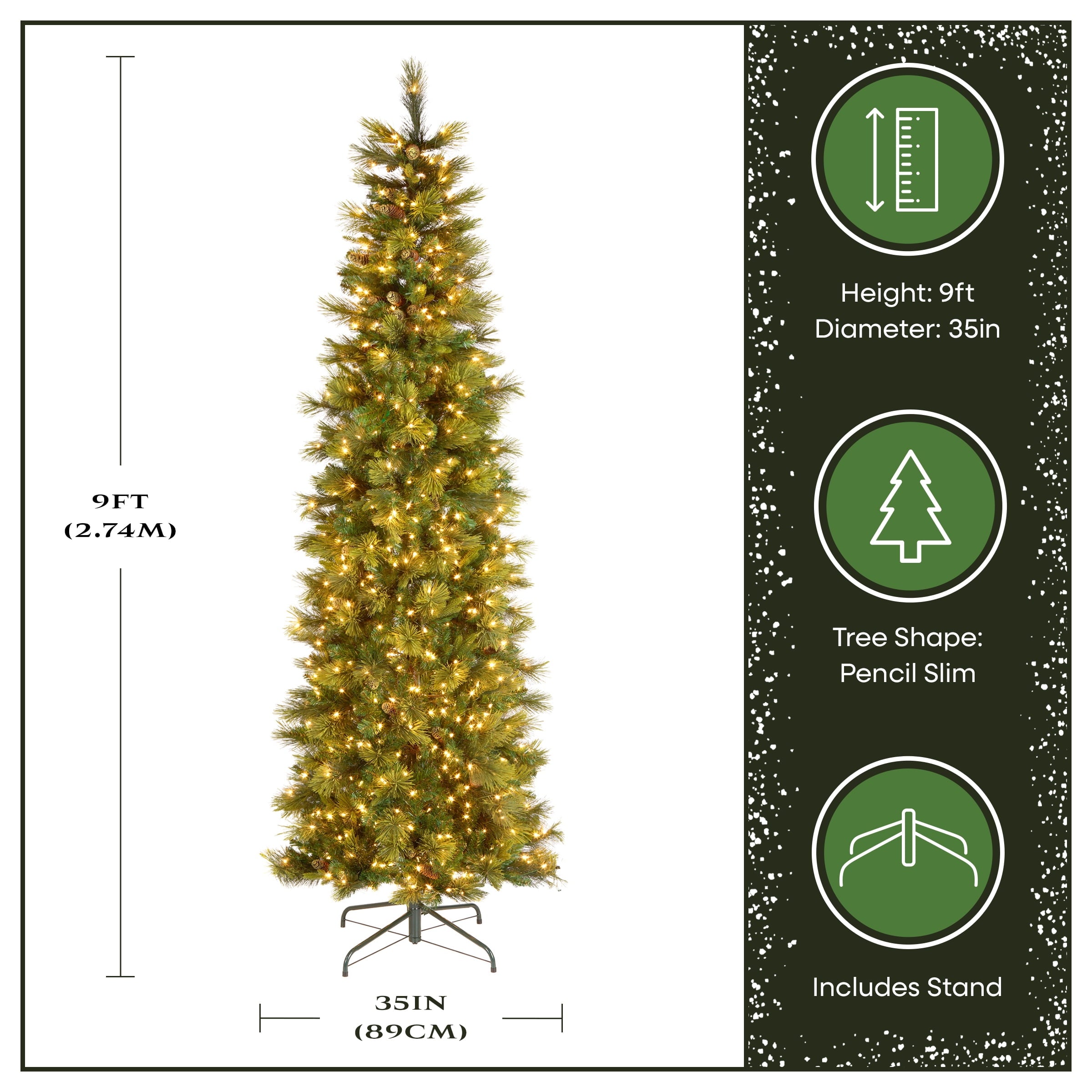 Add festive elegance to any space with the National Tree Company 9 ft Carolina Pine Slim Artificial Christmas Tree. Standing tall at 9 feet with a slim 35-inch base diameter, this pencil profile tree makes a statement even where space is limited. Crafted with 1,126 high-quality PVC branch tips accented with pinecones, it delivers a lifelike look with natural charm. Pre-strung with 800 UL-listed clear incandescent lights that remain lit even if one bulb goes out, this tree ensures a warm, classic glow throughout the season. Hinged branch construction allows for quick and easy setup: branches drop down for shaping and fold back up for compact storage after the season. Built with fire-resistant, hypoallergenic PVC needles and supported by a sturdy metal stand, this tree combines craftsmanship, durability, and timeless holiday appeal. For more than 60 years, National Tree Company has been the trusted leader in artificial greenery and décor, helping families create cherished holiday memories year after year.
