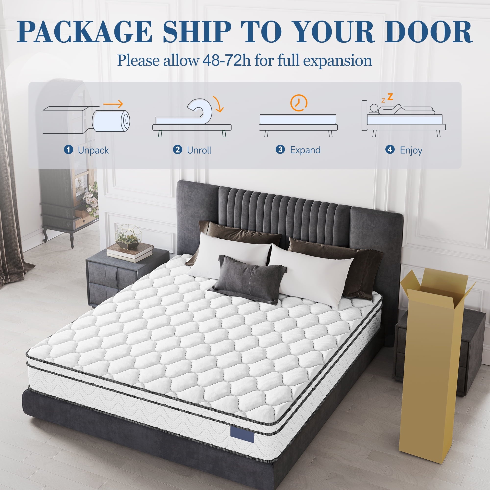 【Note】Please keep distance when opening the mattress from the plastic packing, as it may have a risk to hit back when restoring.