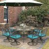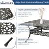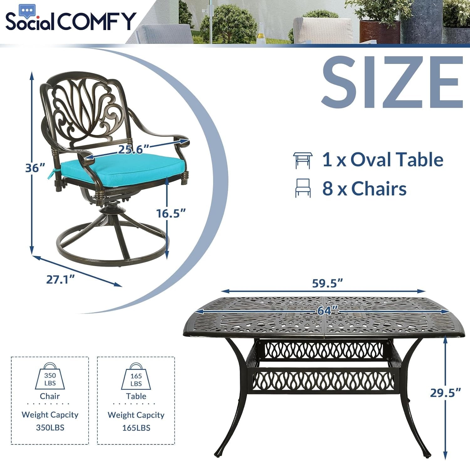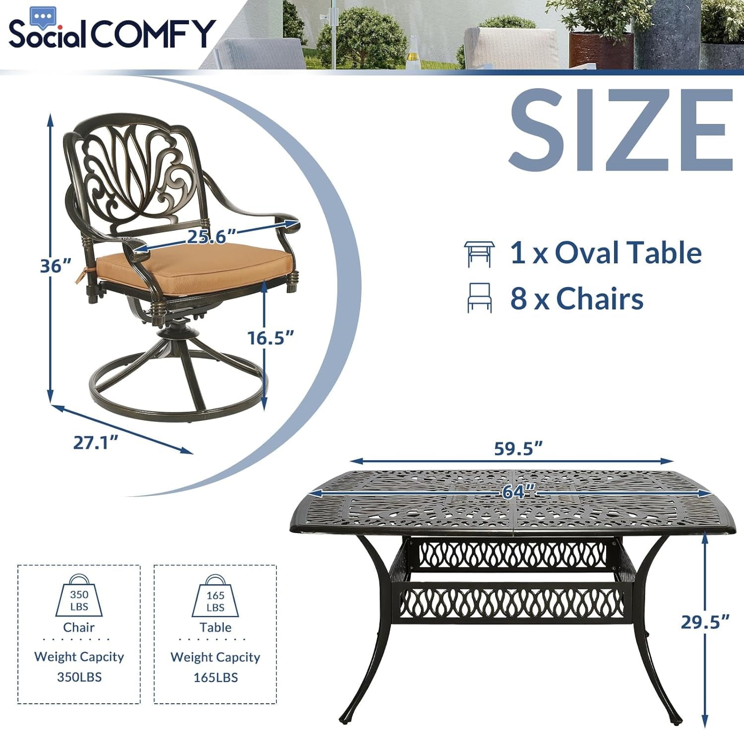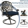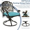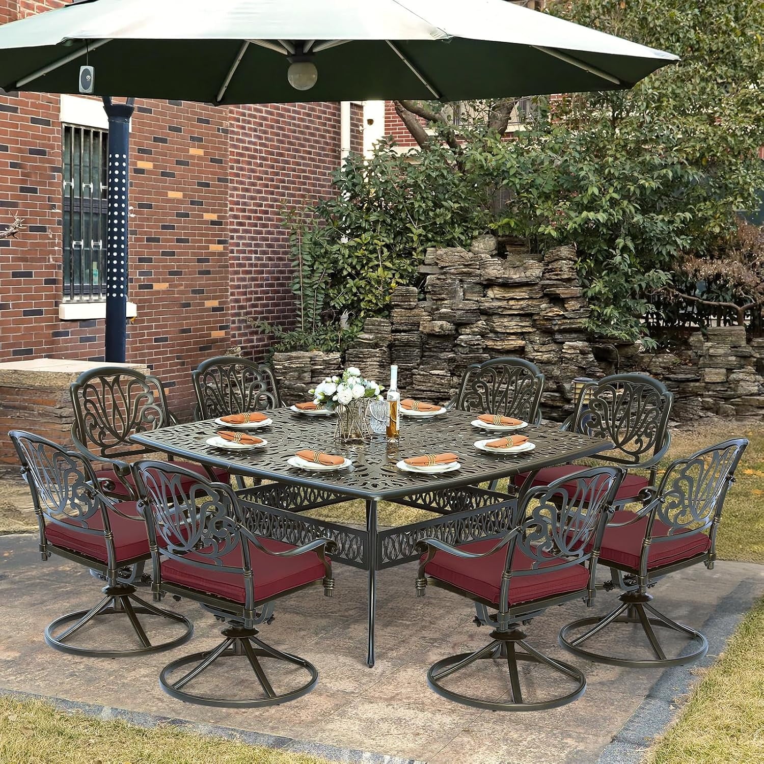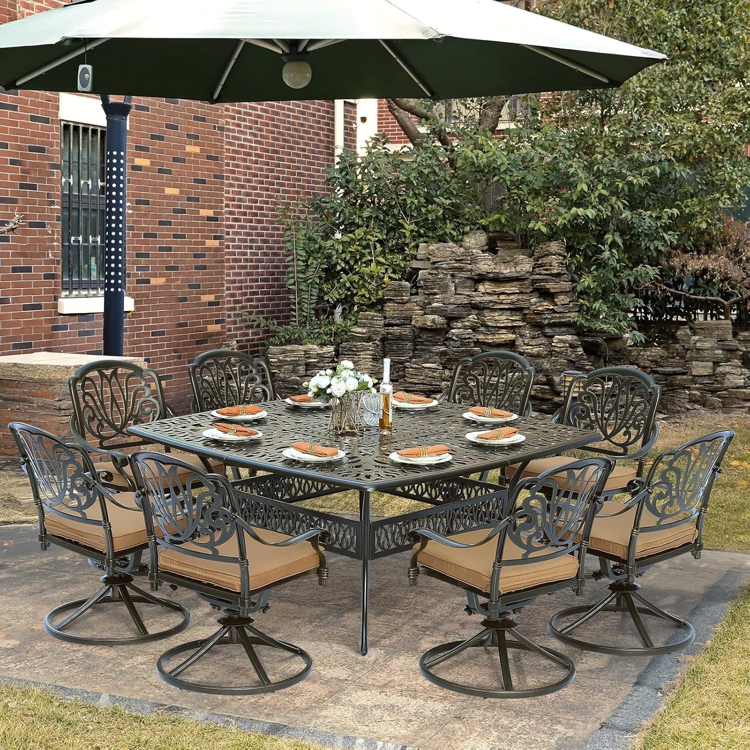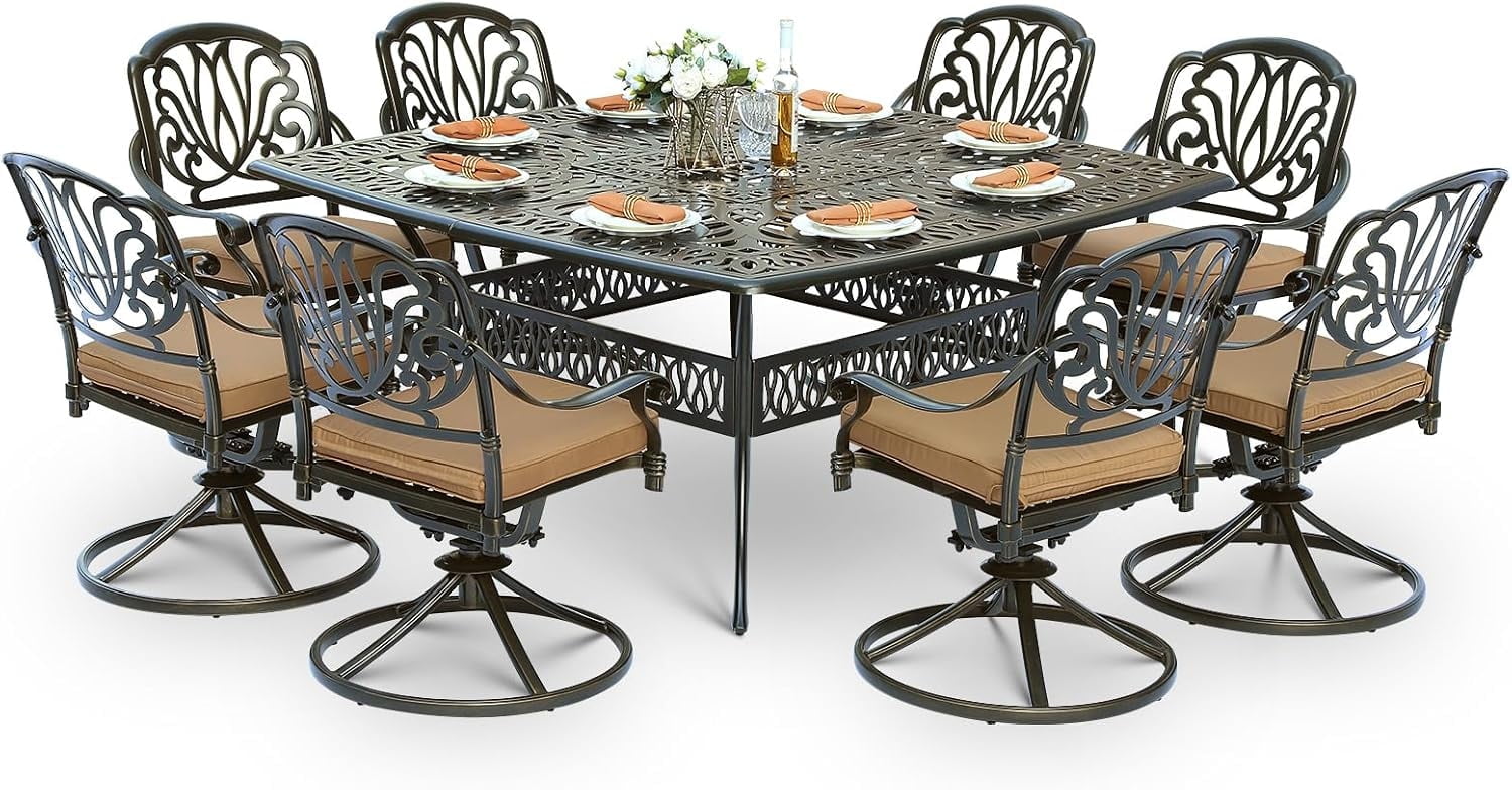 • Eye-Catching 9 Piece Dining Set – This patio dinging set includes 1 square dining table and 8 cushioned swivel rocker chairs that provide enough locations for backyard BBQs, friendly get-togethers, and year-round celebrations. The antique bronze finish with beautiful blooming flower and symmetrical design is not only classic but also elegant, making this dining set a stunning focal point on your patio, garden or deck