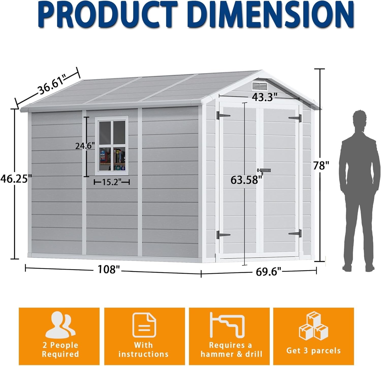 - 【SPACIOUS 9’x5.8′ STORAGE SHED】 Roof: 108″(L)x37″(W); Base: 69.6″(L)x 108″(W); Hight 78″(H). Our resin shed offers a generous amount of storage room for various items such as gardening tools, outdoor sports gear, and seasonal items. It serves as a valuable extension to your yard, whether storing tools providing a cozy home for your pet, or used as a bin storage room, it can satisfy your various requirements