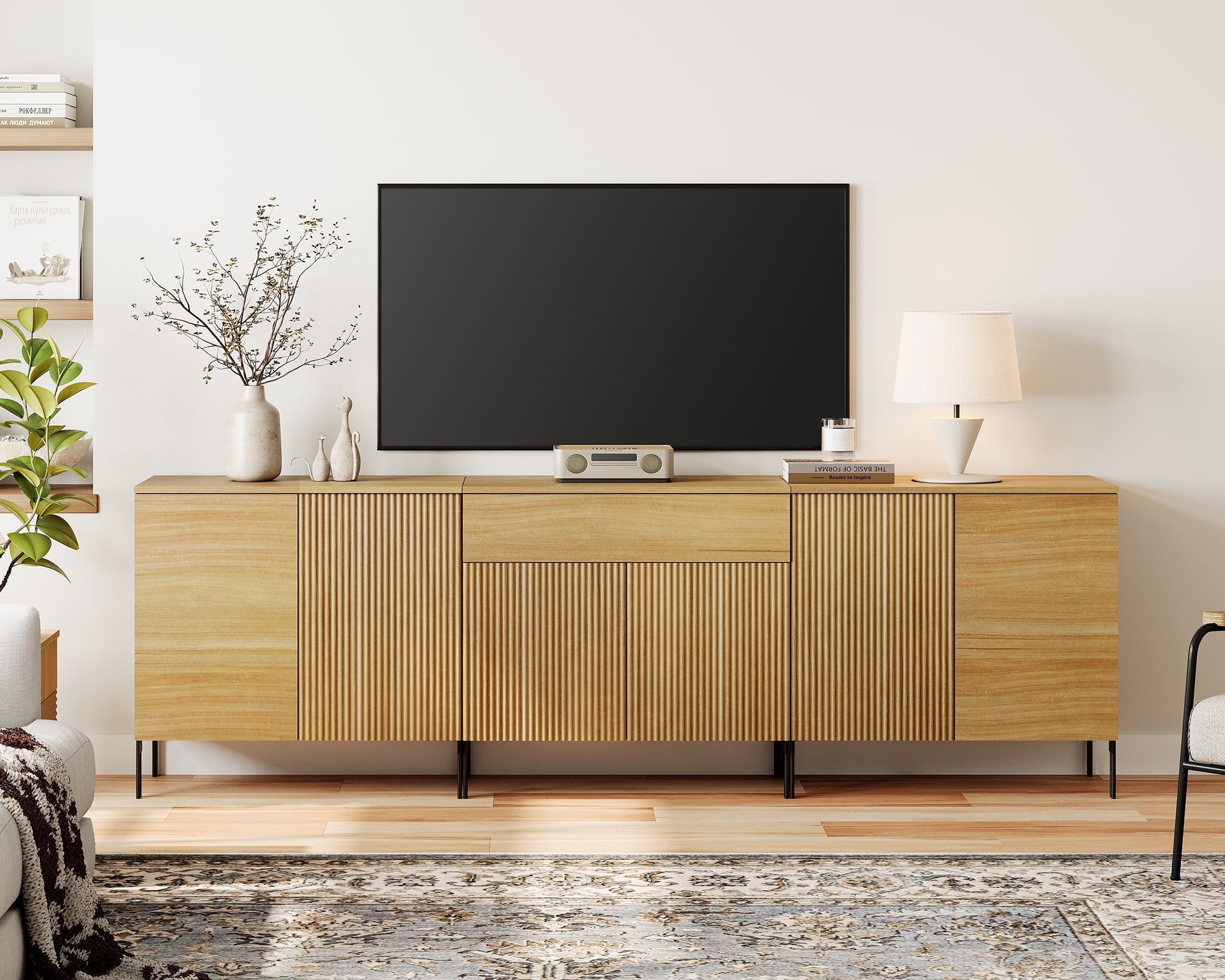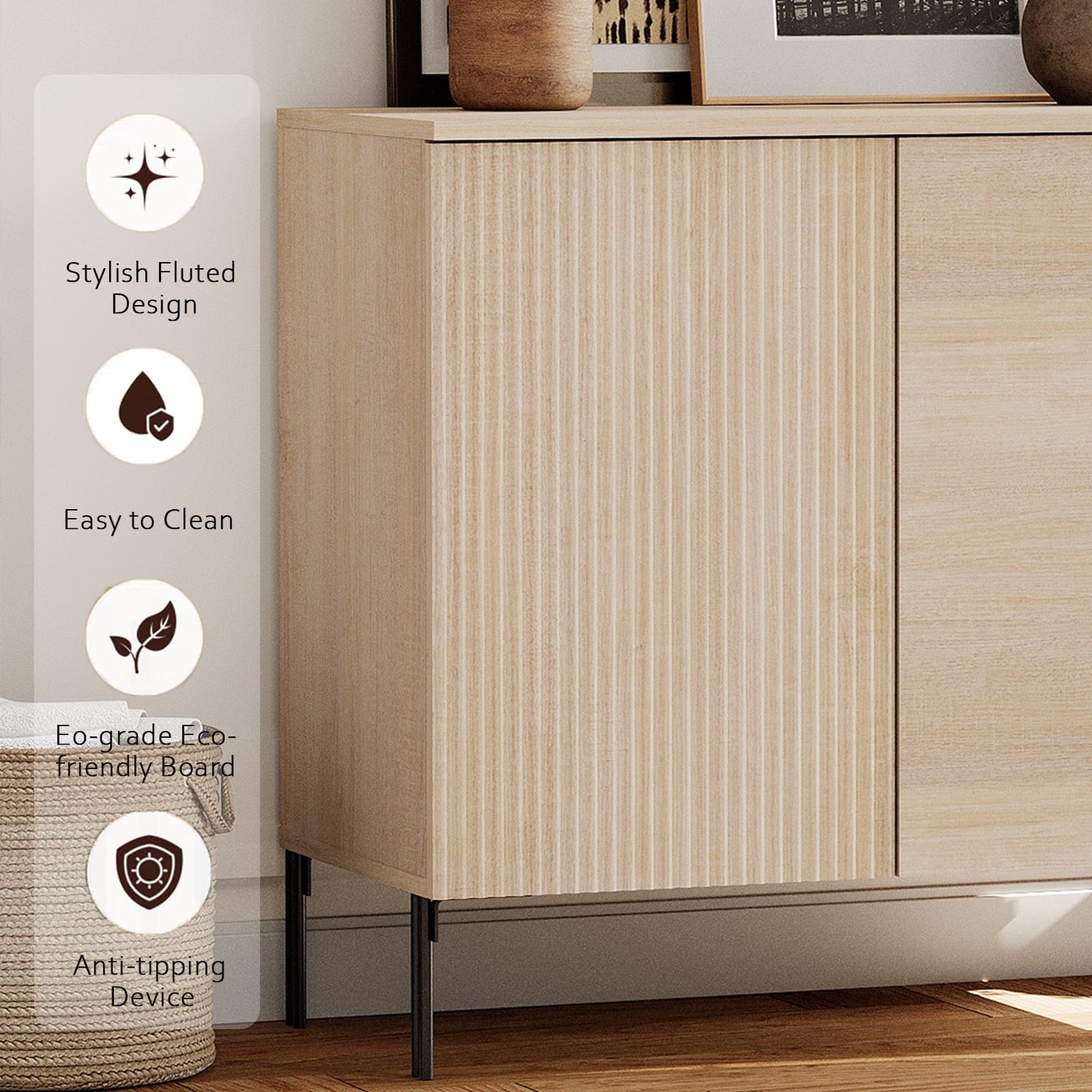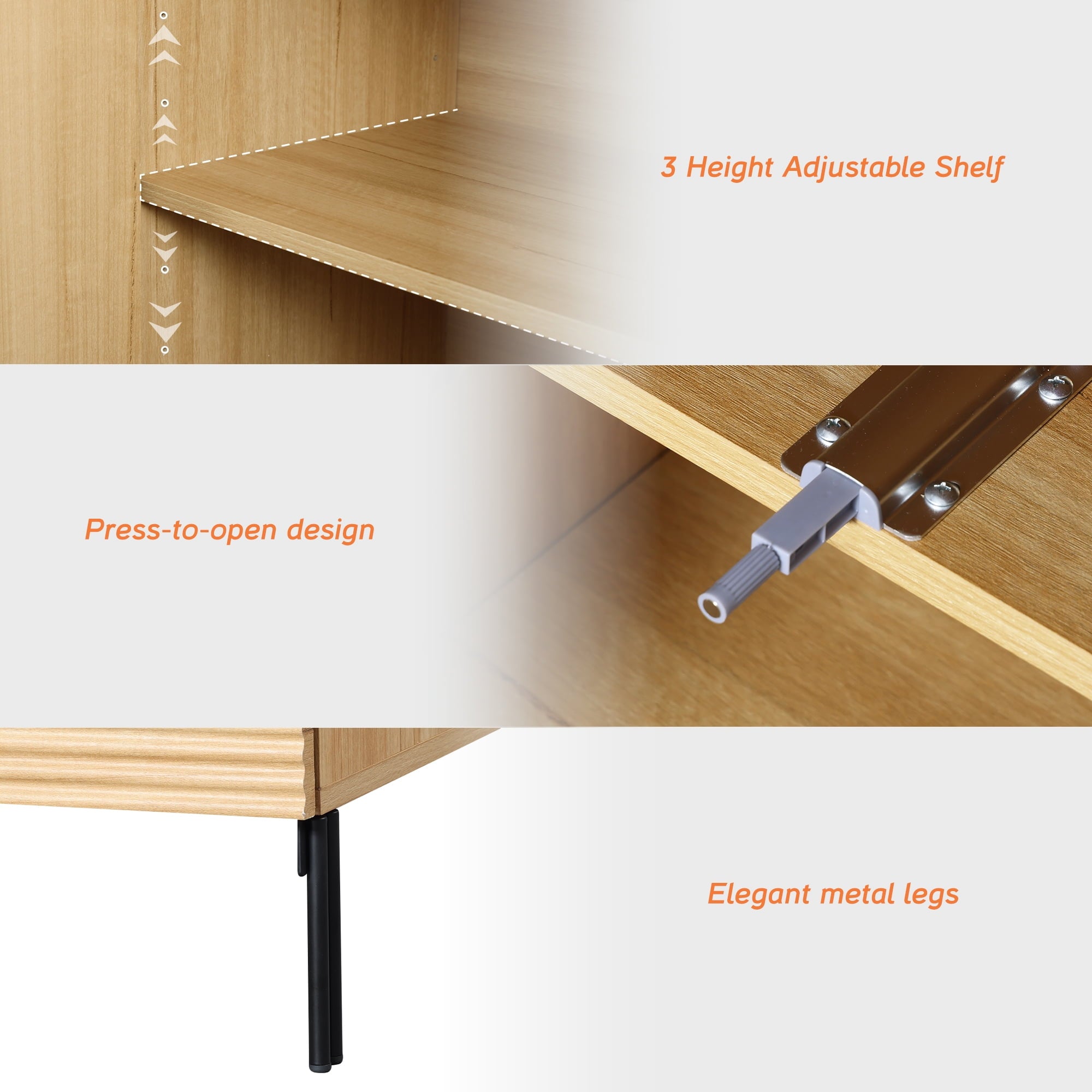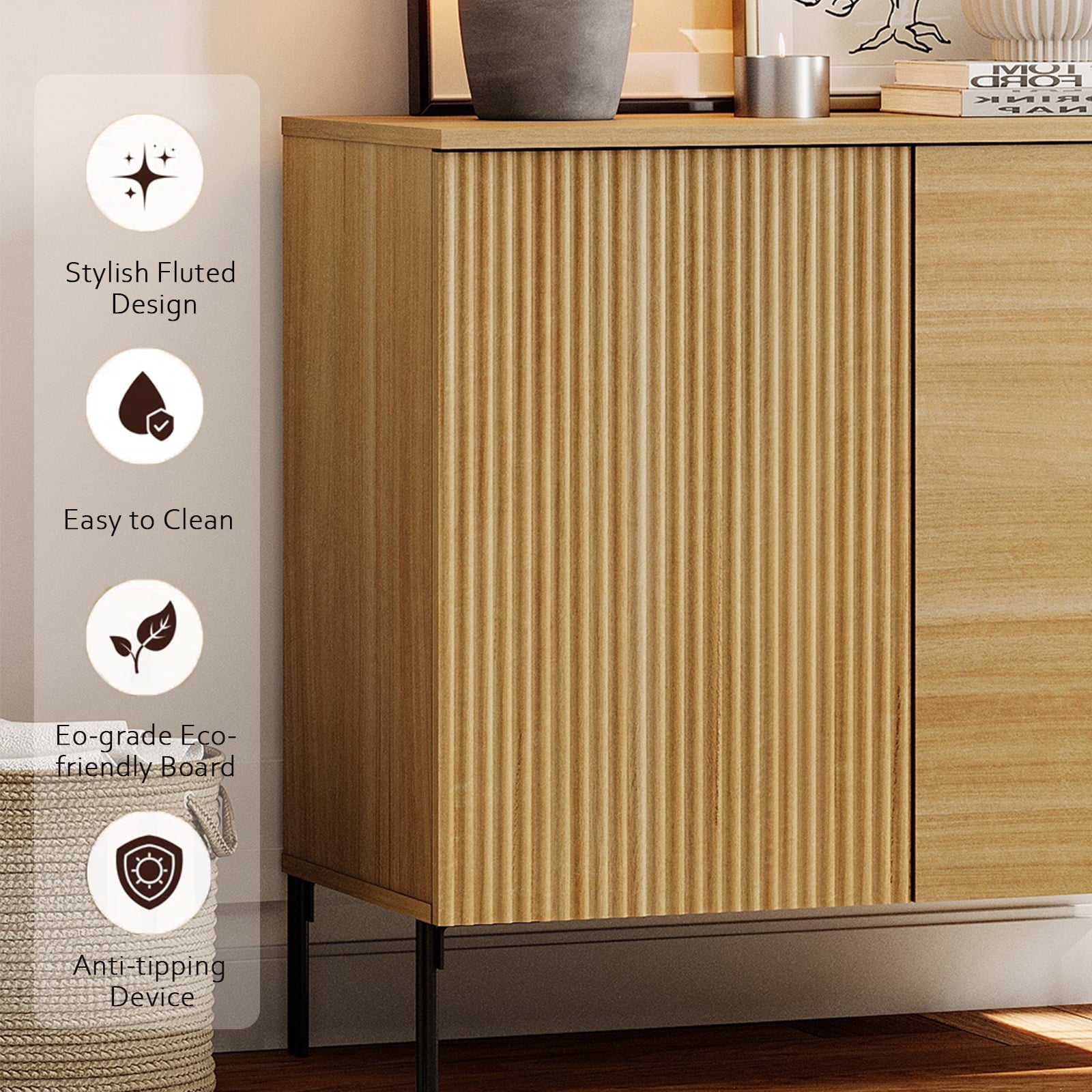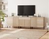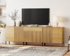 - Slatted Design: Our modern TV Stand features a unique reeded design and push-to-open drawers that seamlessly blends elegant lines with a smooth, textured surface, enhancing visual appeal and modern aesthetics. Slim, chopstick-inspired legs elevate the piece with airy lightness.