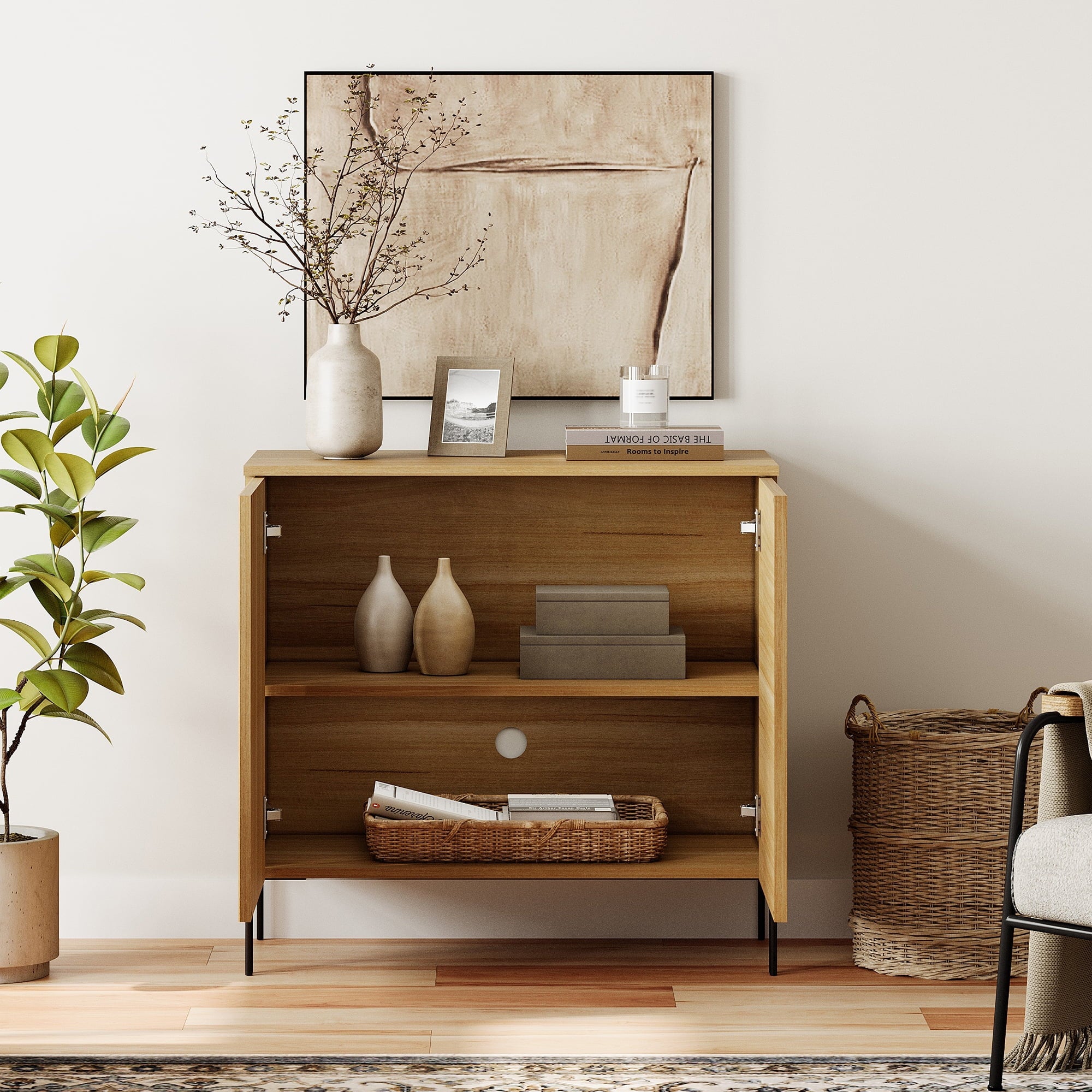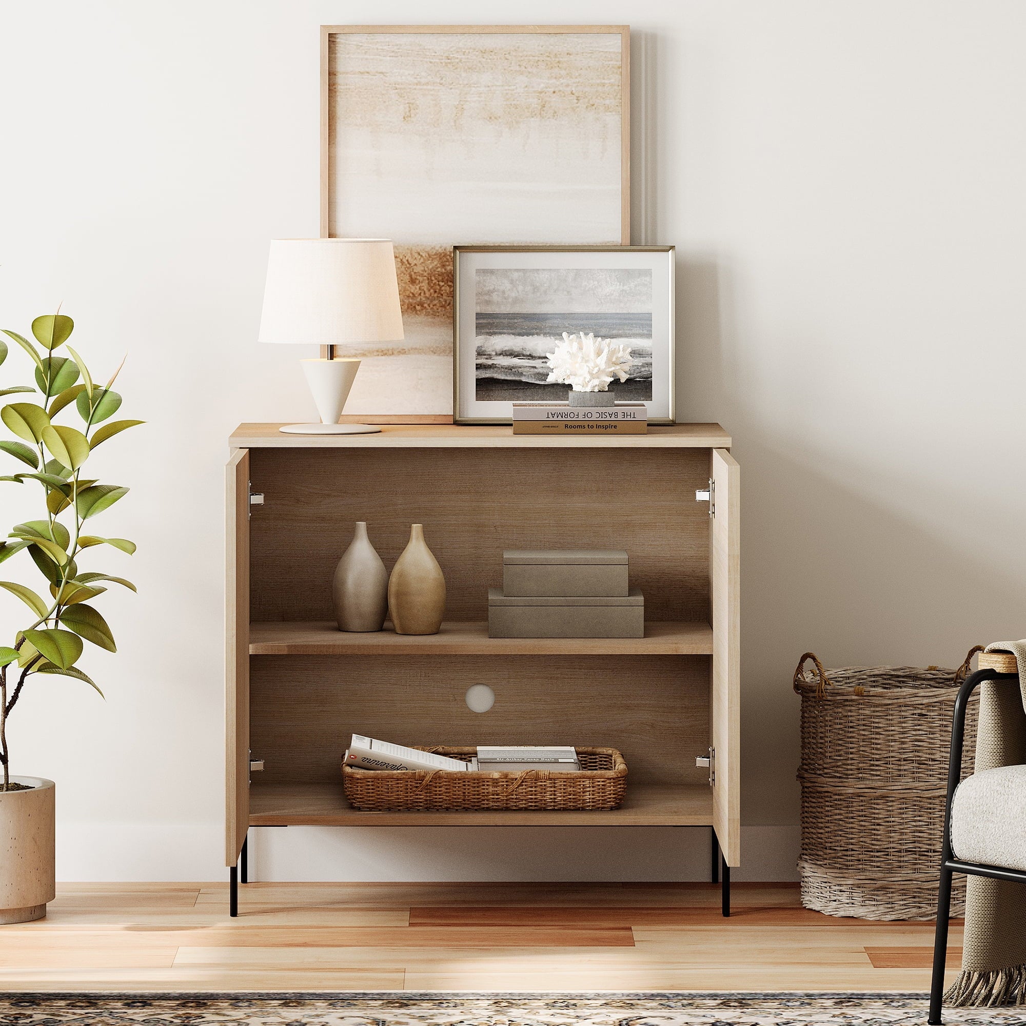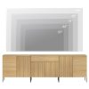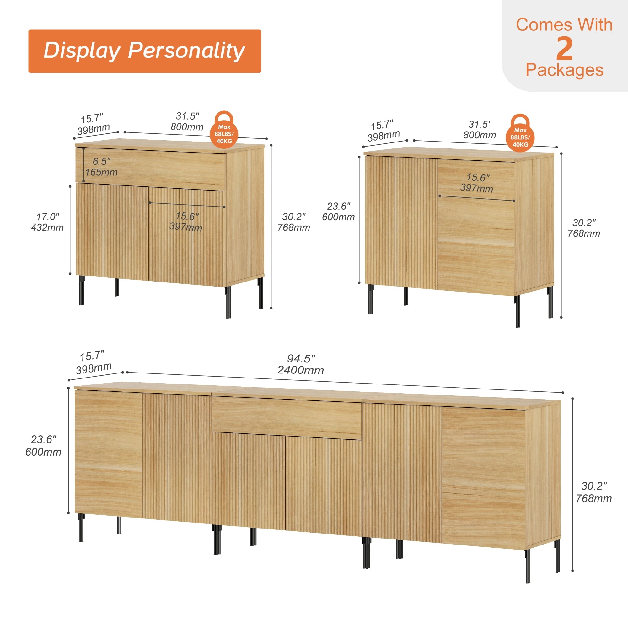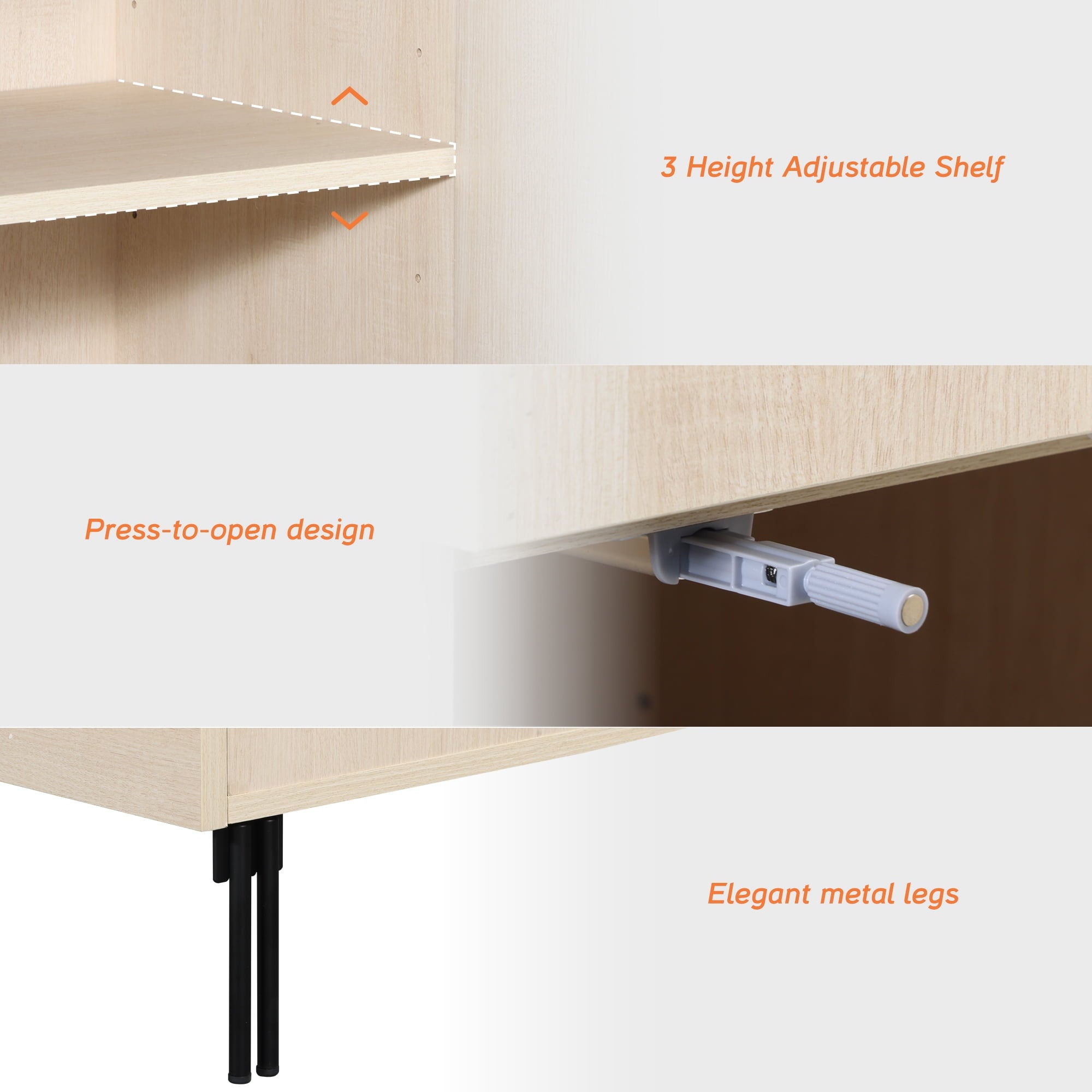 - Slatted Design: Our modern TV Stand features a unique reeded design and push-to-open drawers that seamlessly blends elegant lines with a smooth, textured surface, enhancing visual appeal and modern aesthetics. Slim, chopstick-inspired legs elevate the piece with airy lightness.