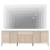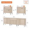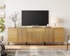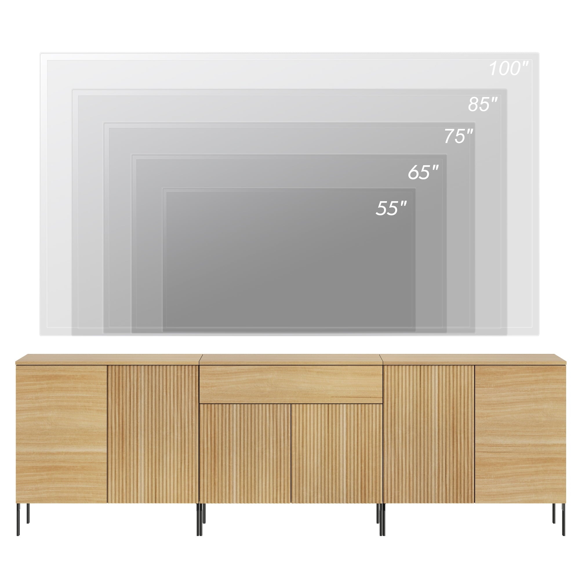 Elevate your entertainment setup with the elegant 94.5″ TV Stand. Its classic soft-finish painted MDF top and sleek metal legs blend effortlessly with any décor, while a discreet push-to-open system and refined reeded front panels add modern sophistication. The generously sized drawers keep remotes, game controllers, cables, and media accessories neatly hidden yet easily accessible, and the water-resistant, scratch-proof surface stands up to daily use. High legs let robotic vacuums glide underneath for effortless cleaning, and an included anti-tip kit ensures safety around kids and pets. Designed for living rooms, bedrooms, or dens, this versatile stand delivers stylish storage and sturdy support for TVs up to 100″.