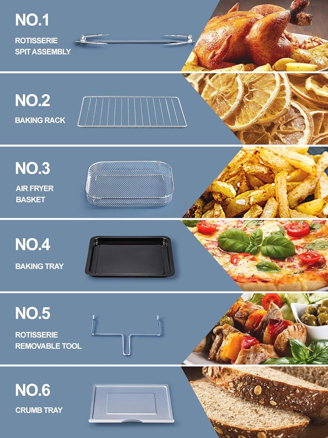 • 6 Free Accessories – Rotisserie spit, drip tray, baking pan, wire rack, and more