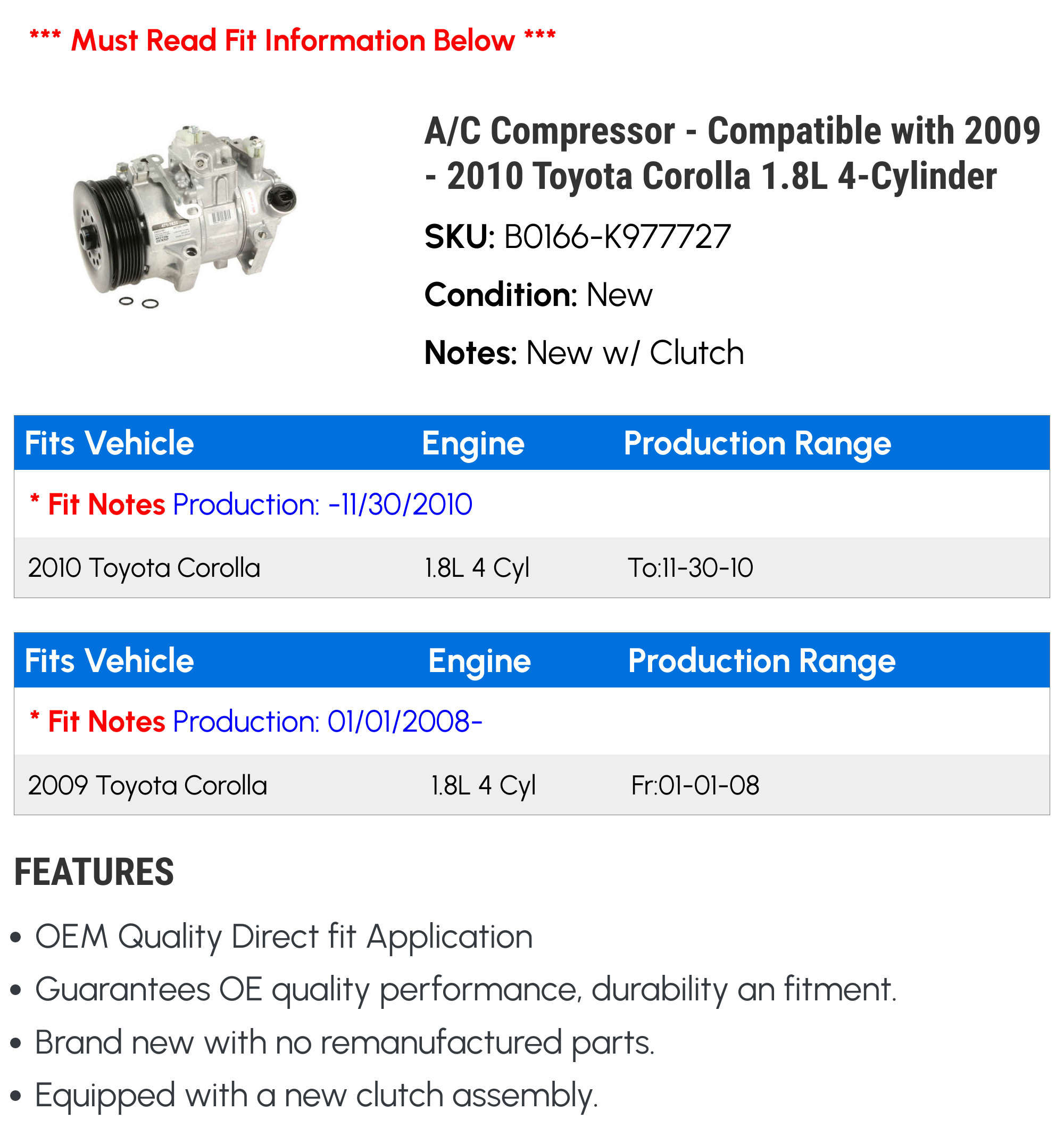 A/C Compressor – Compatible with 2009 – 2010 Toyota Corolla 1.8L 4-Cylinder