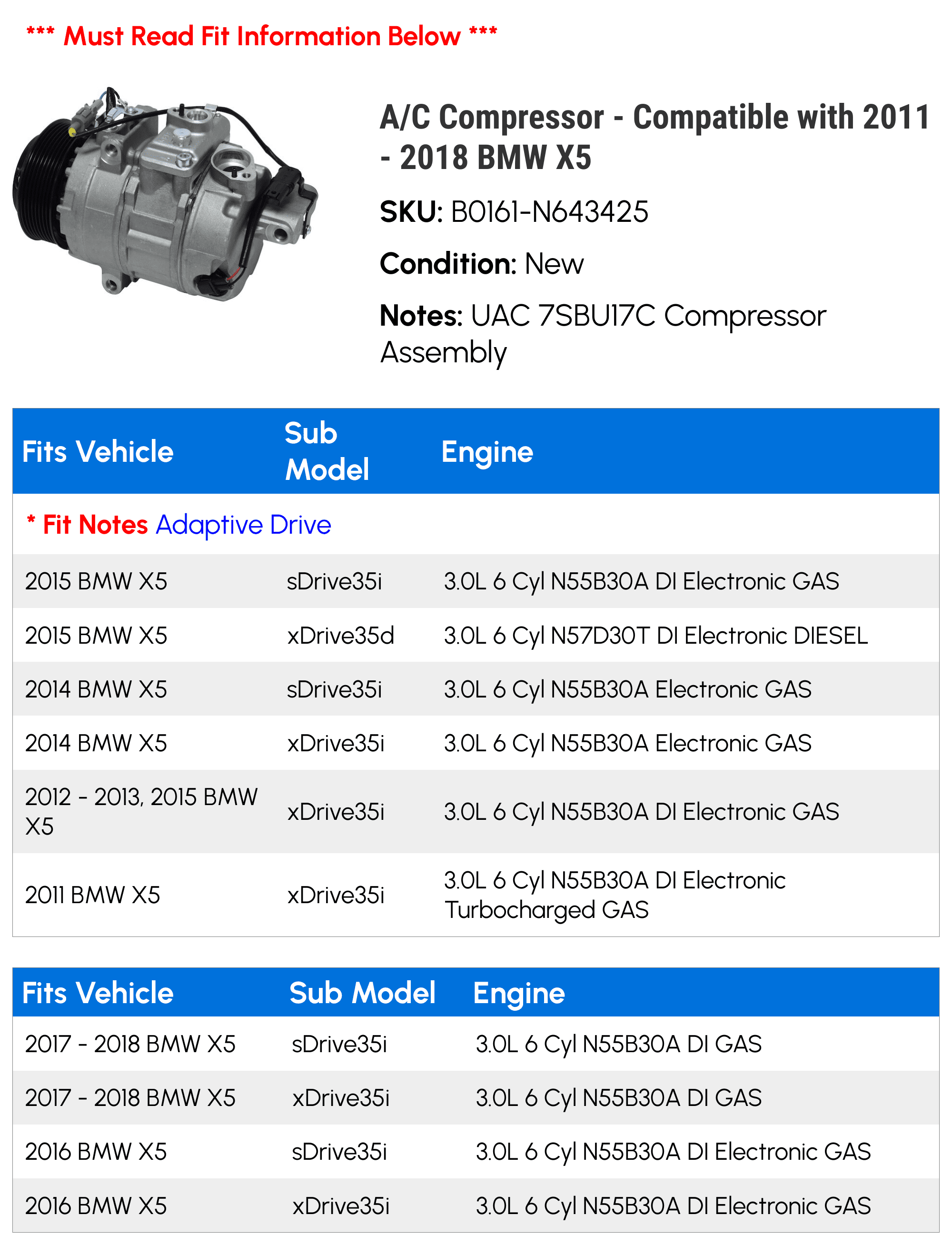 A/C Compressor – Compatible with 2011 – 2018 BMW X5