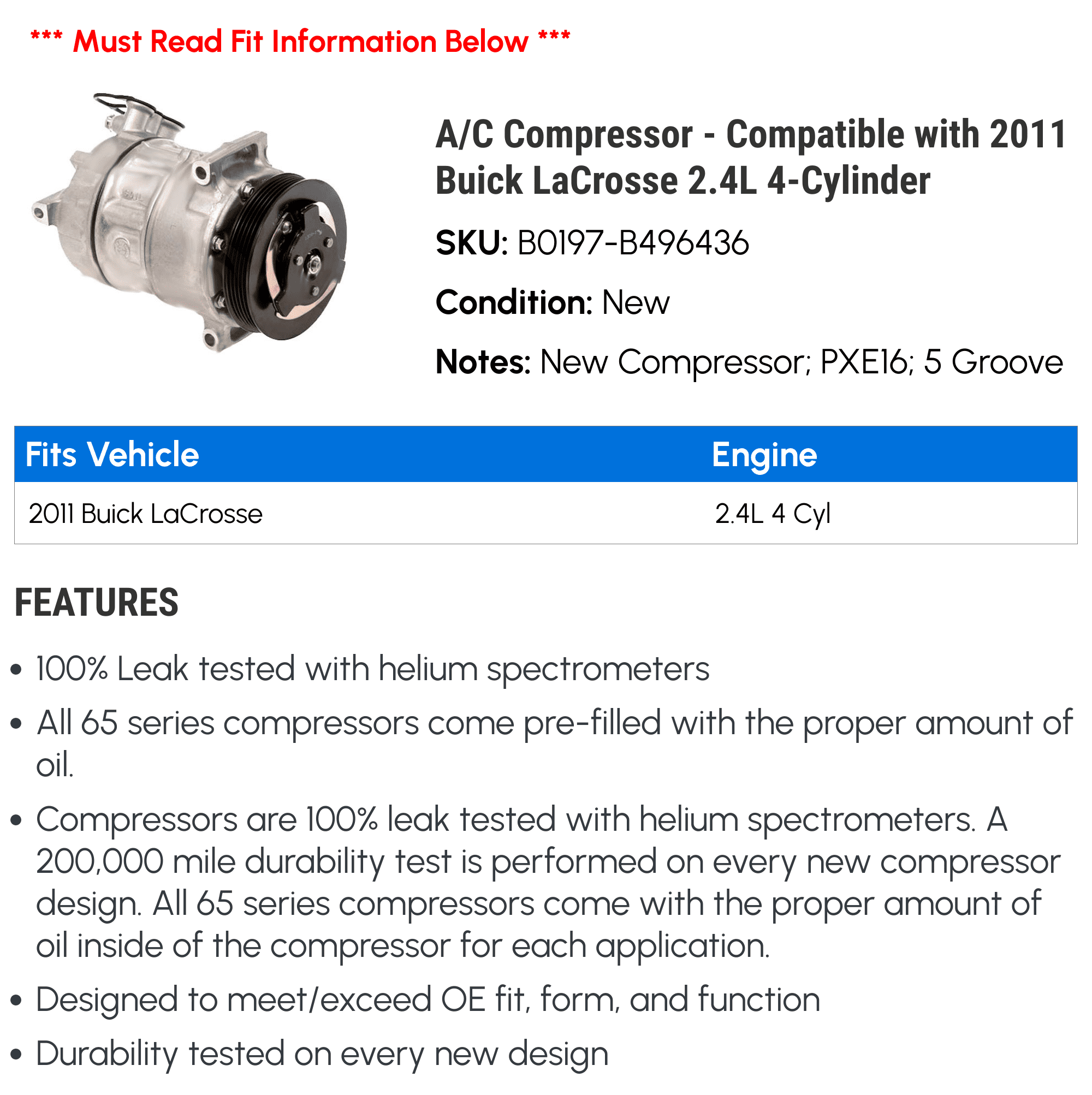 A/C Compressor - Compatible with 2011 Buick LaCrosse 2.4L 4-Cylinder