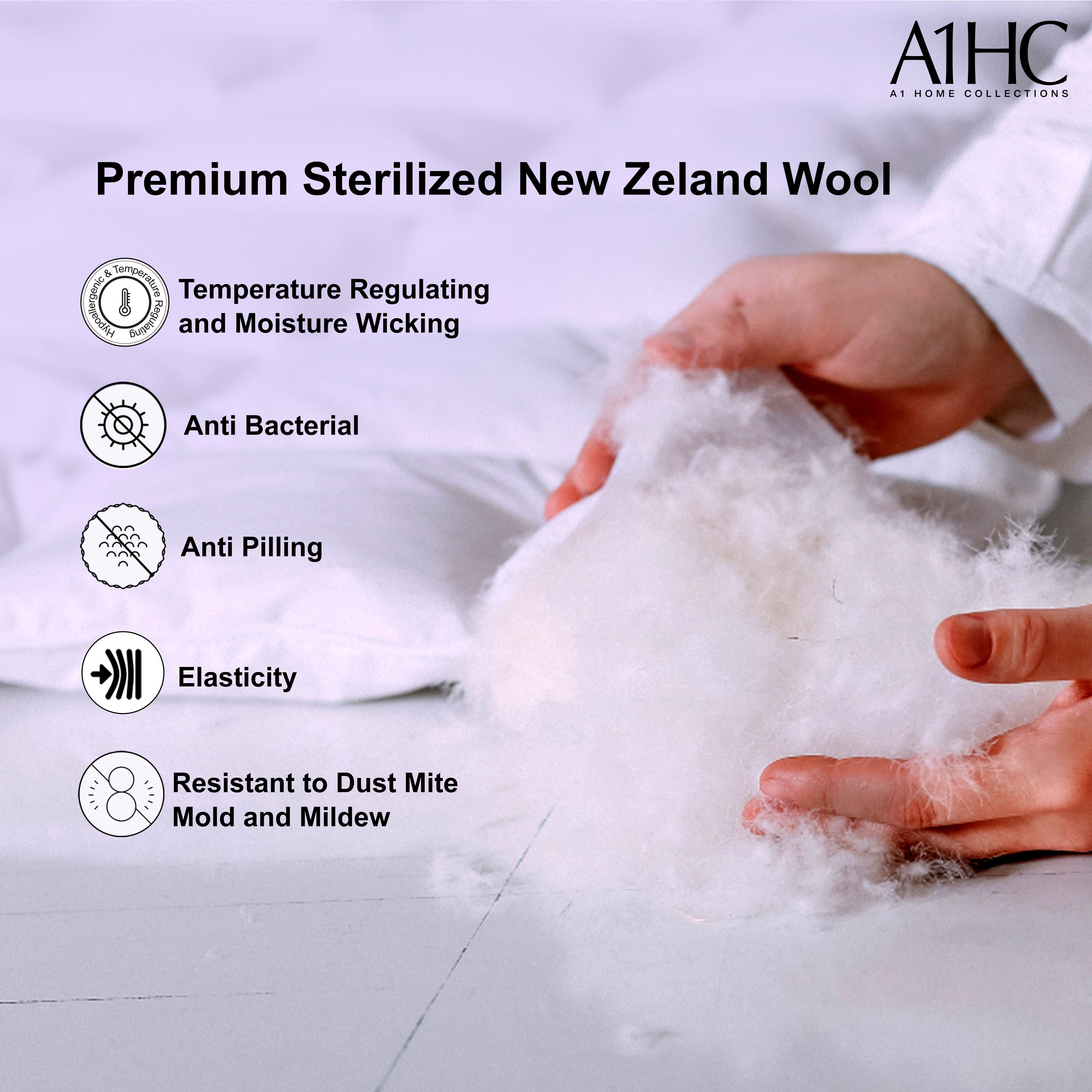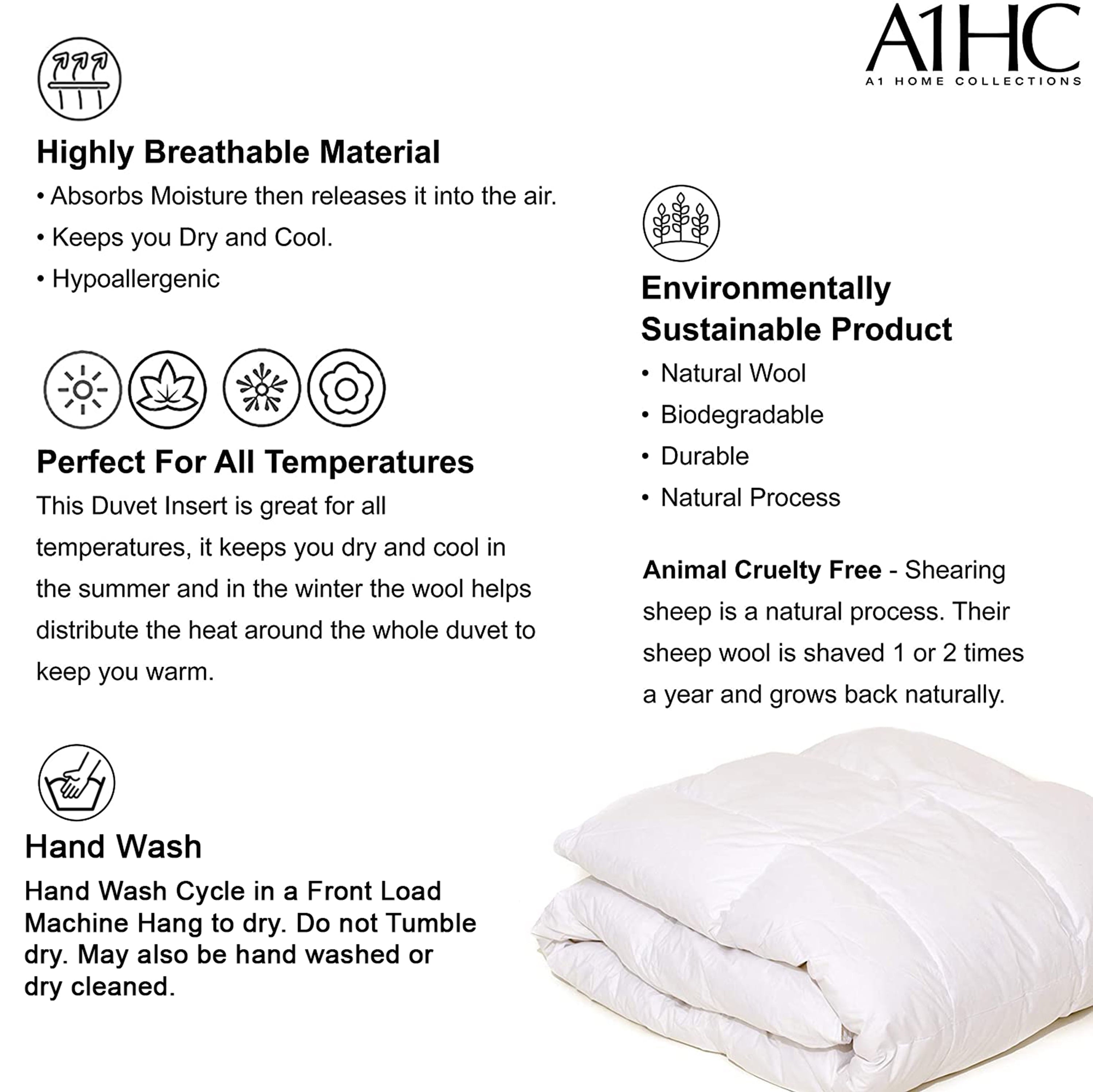 Our deluxe range of Wool duvet inserts use wool from New Zealand farms the wool is hand selected and have full farm provenance The outer cover is a 200 thread count certified organic cotton A1HC 100 Organic Cotton Shell Wool comforter 200 GSM Comforter Duvet Insert is ideal as a summer spring duvet insert A lightweight wool duvet perfect for use in warmer weather It is filled with extra fluffy premium wool from New Zealand and covered in a fine organic cotton cover Your A1HC Summer Duvet insert will keep you at an even temperature whether the outside air is warm or cool The wool is also breathable so you don t overheat This keeps you comfortable over a range of temperatures The Comforter Duvet Insert has a fill weight 200 GSM is which makes it soft warm hypoallergenic and lightweight The shell of the duvet insert is 100 organic cotton which are GOTS Certified Global Organic Textile Standard GOTS Certification assures the duvet insert fabric is nontoxic chemical free for your entire family Enjoy breathable inserts which are naturally grown without any pesticides These are authentic and certified by the highest body for being organic ensuring your comfort and safety A lightweight comforter relieves pressure during sleeping You may experience tossing and turning all night just because of heavy weight on you Our Wool comforter duvet insert is your best choice A washable comforter is easy to clean Machine wash in the gentle cycle with cold water sun dry or tumble dry on low when needed Why Choose Us We think two words are crucial quality Service What we want is more and more customers recognize and support us and develop their brand loyalty