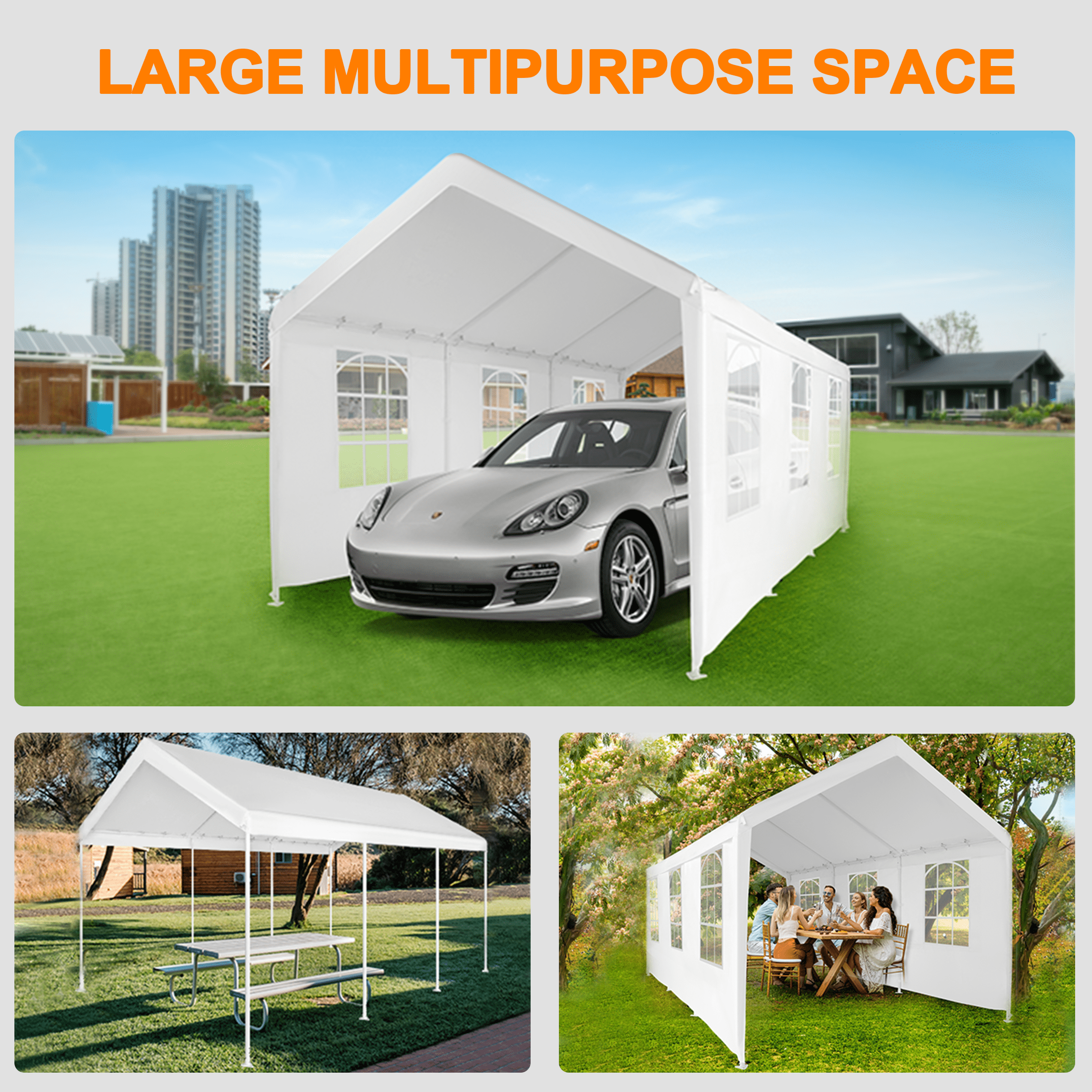 Discover the perfect blend of style and practicality with our sleek carport. Designed to protect your vehicles from the elements, this 10×20 ft heavy-duty canopy offers a spacious shelter for cars, trucks, and boats. Quick to install with V-shaped anchor rods and L-shaped ground nails, it provides stability on any terrain, complemented by a thickened galvanized frame for enhanced safety. Ideal for outdoor activities, it transforms into an open space for gatherings once the sidewalls are removed. Embrace the modern solution for vehicle protection and outdoor events with our versatile and cost-effective carport.