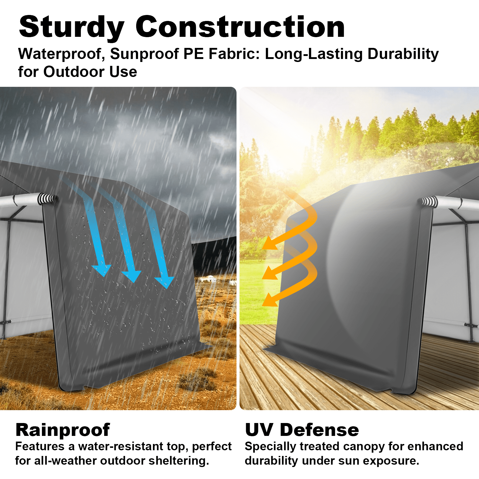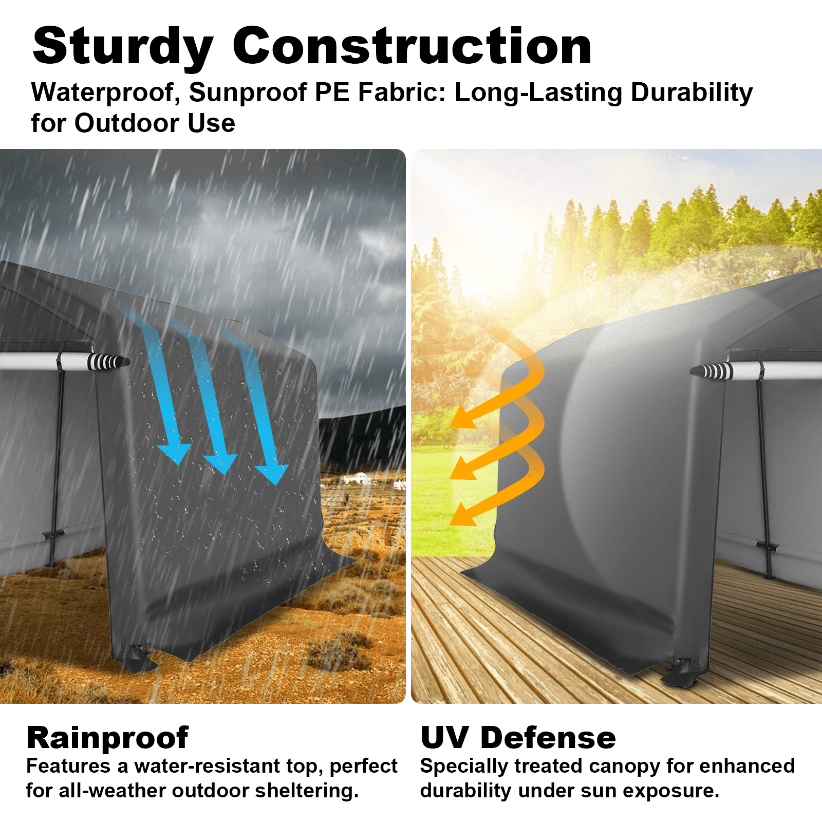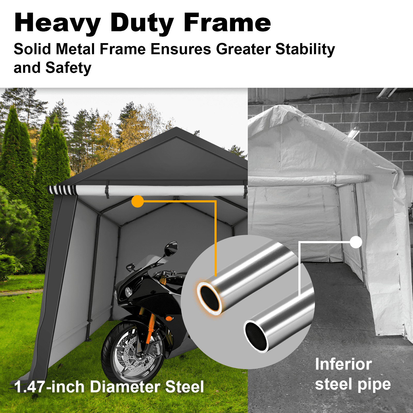 - 【Heavy Duty Durable Frame】1.5 inches diameter steel poles provide stability and strength to make the storage shelter carport safer. The garage storage tent is equipped with upgraded 1.2mm thick legs, thickened and enlarged to increase stability.
