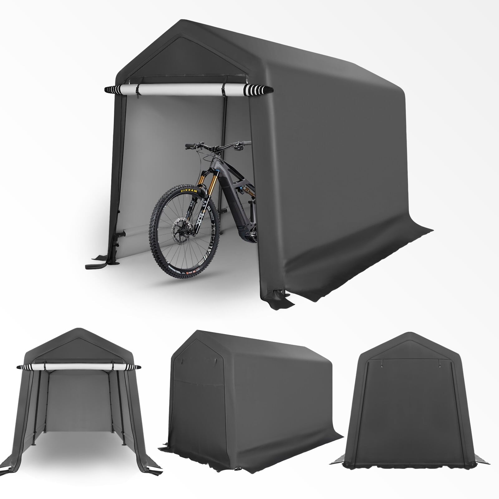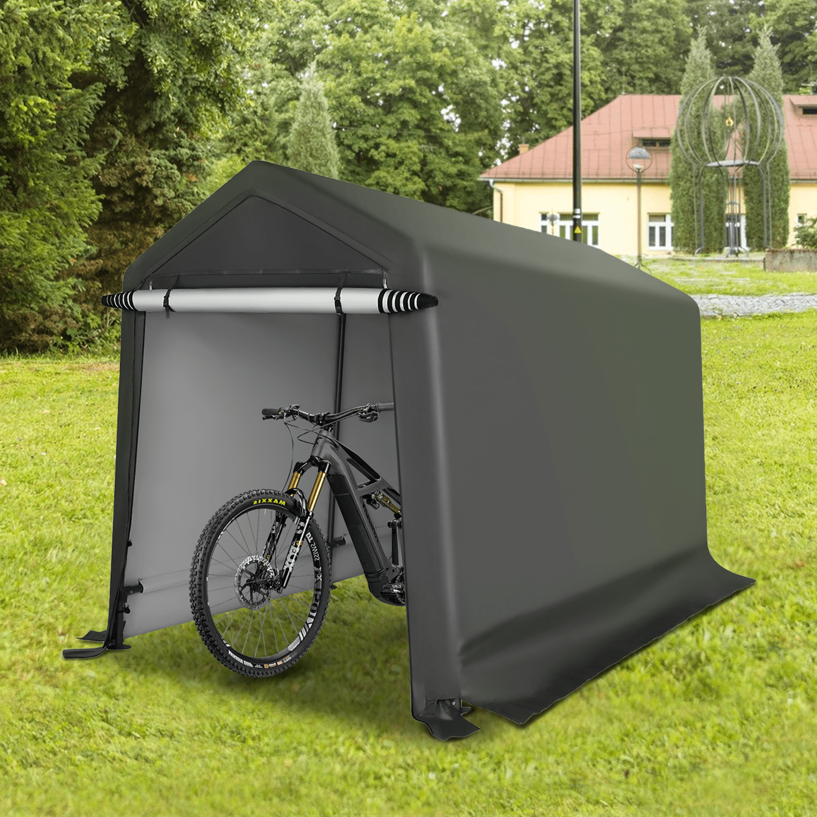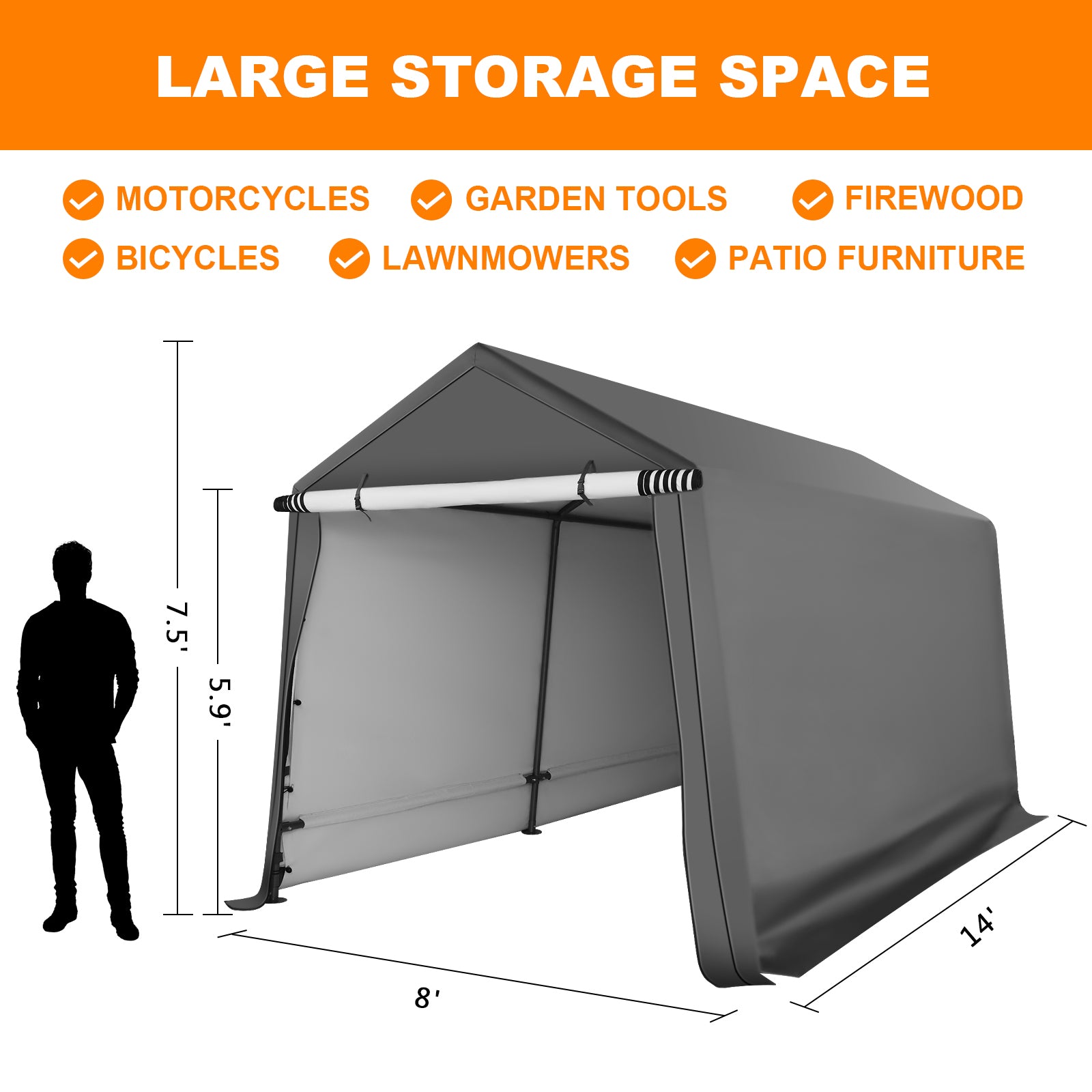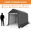 - 【Various Use】The portable storage shelter can be a motorcycle storage shelter, ATV storage shed, bike storage tent, or small vehicle garage shelter. It is also suitable for small lawnmowers, firewood or any other gardening tools.