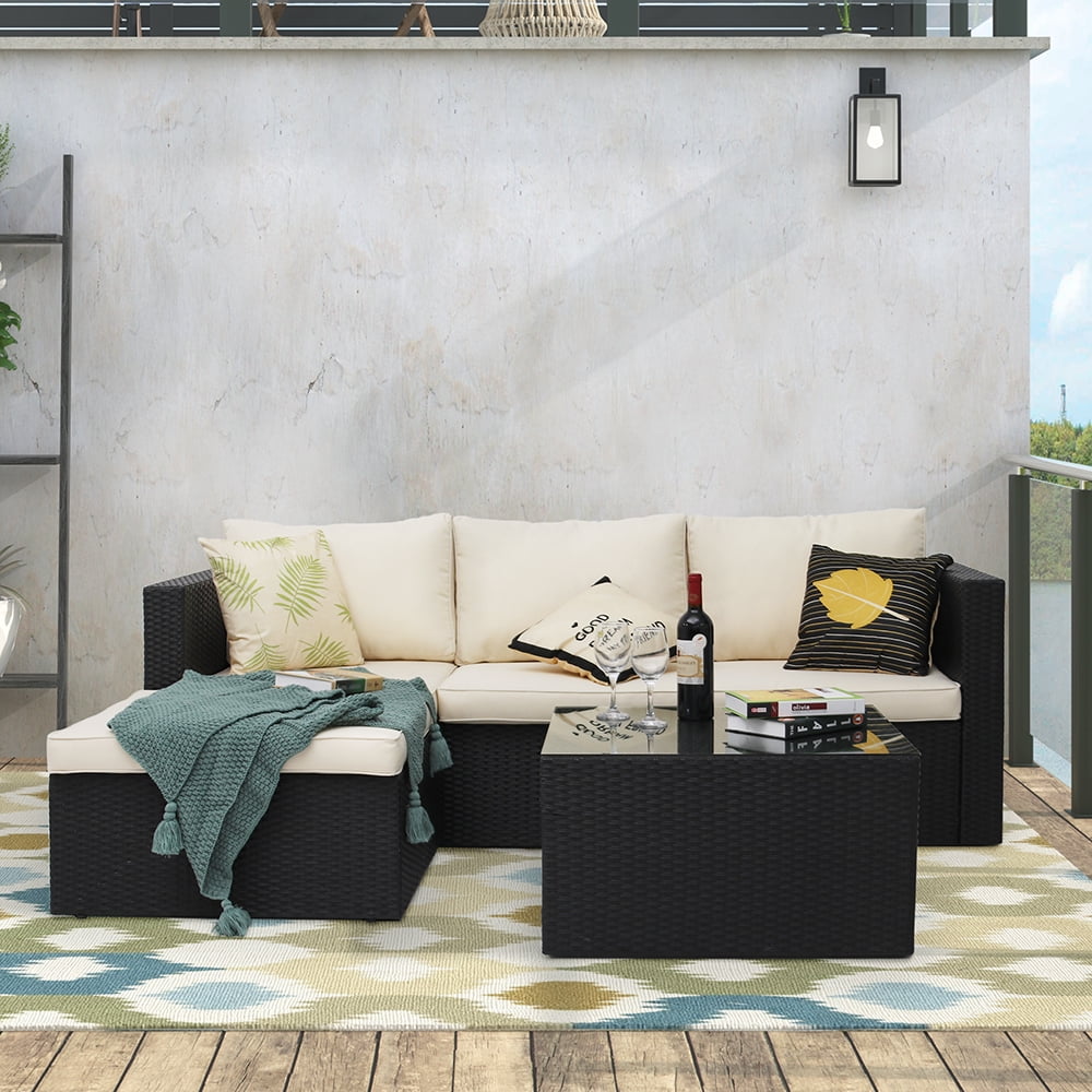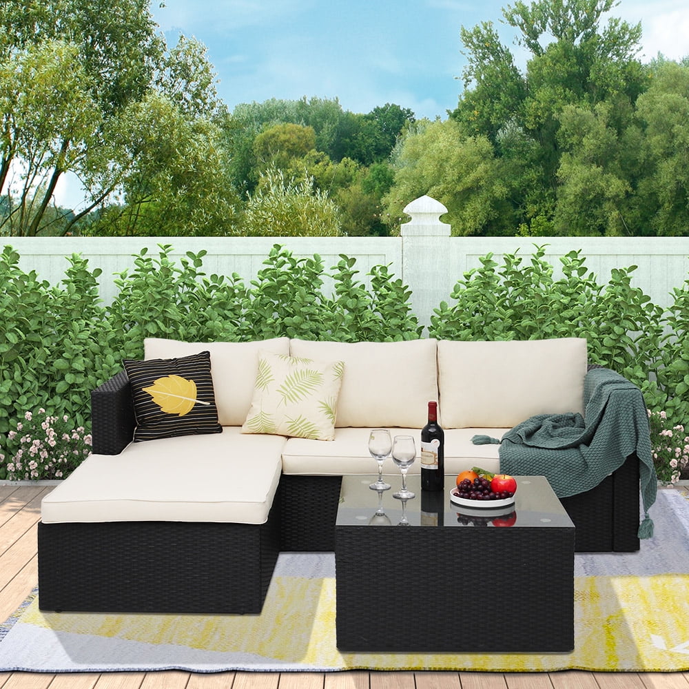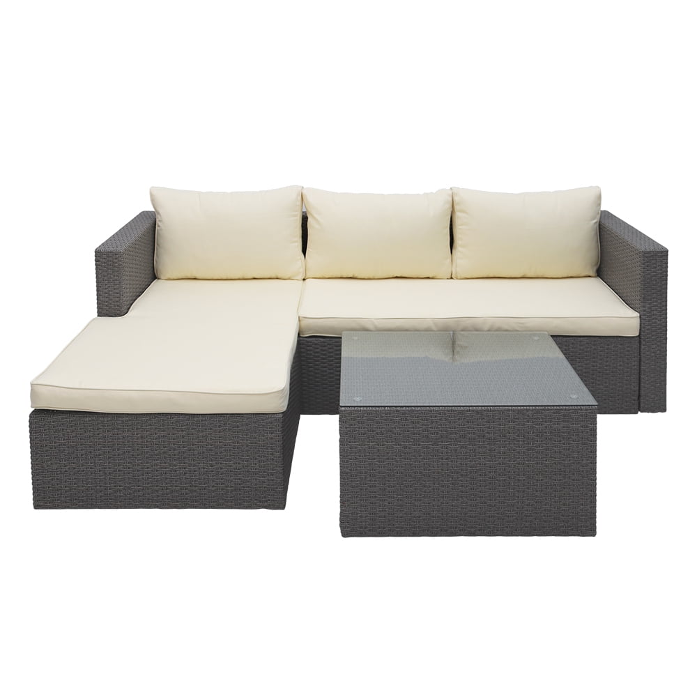 This movable design allows you to adjust the chaise seaters in left or right side to fit your place. All-weather resistant wicker modern design, widely used for outdoor patio, porch, backyard, balcony, poolside, garden and other suitable space in your home. This sectional seating group includes one 3-seaters sofa with chaise and a tempered glass top coffee table that will add a little bit of style and class to any outdoor setting, Brighten your backyard with a stylish outdoor furniture set and make the outside of your home just as inviting as the inside.
