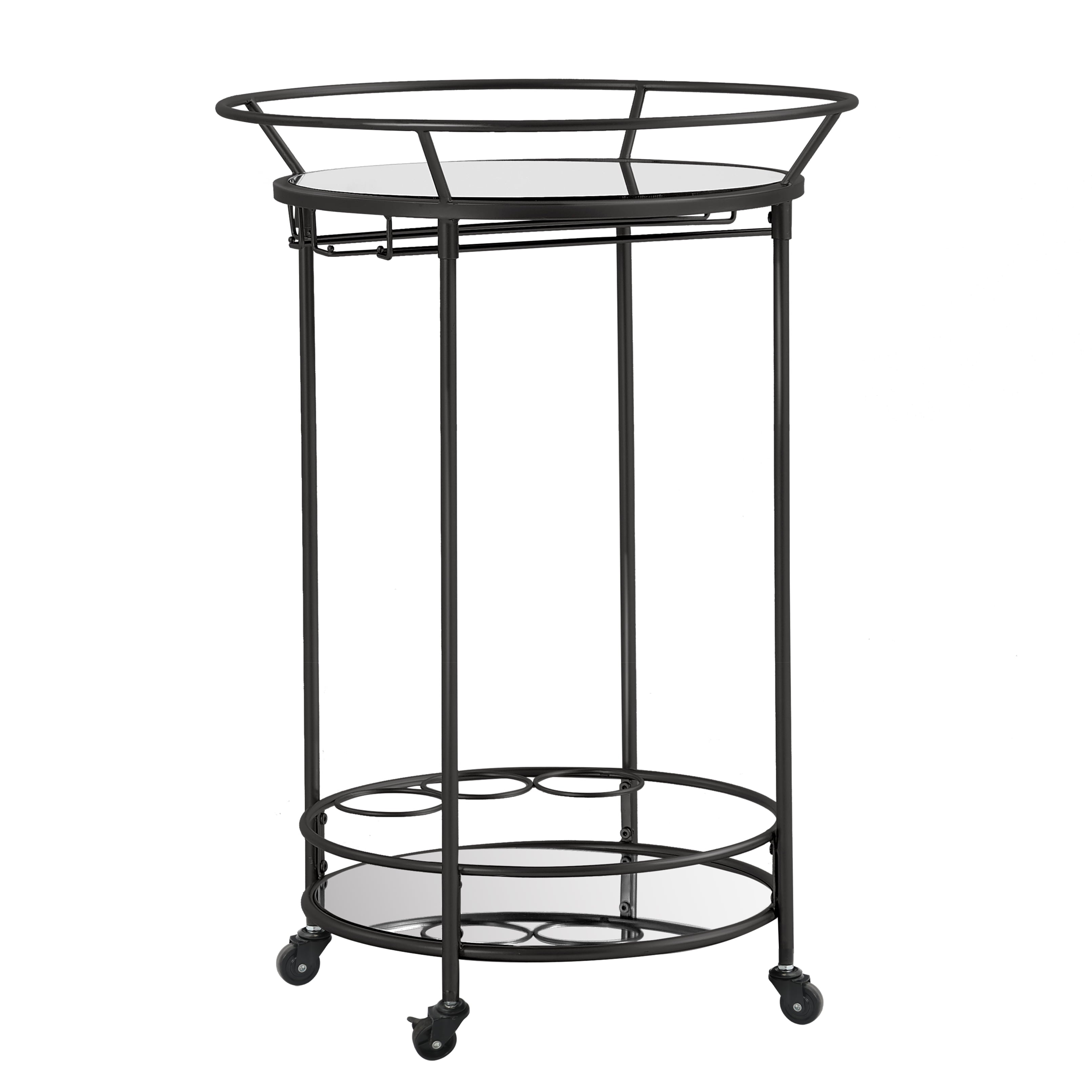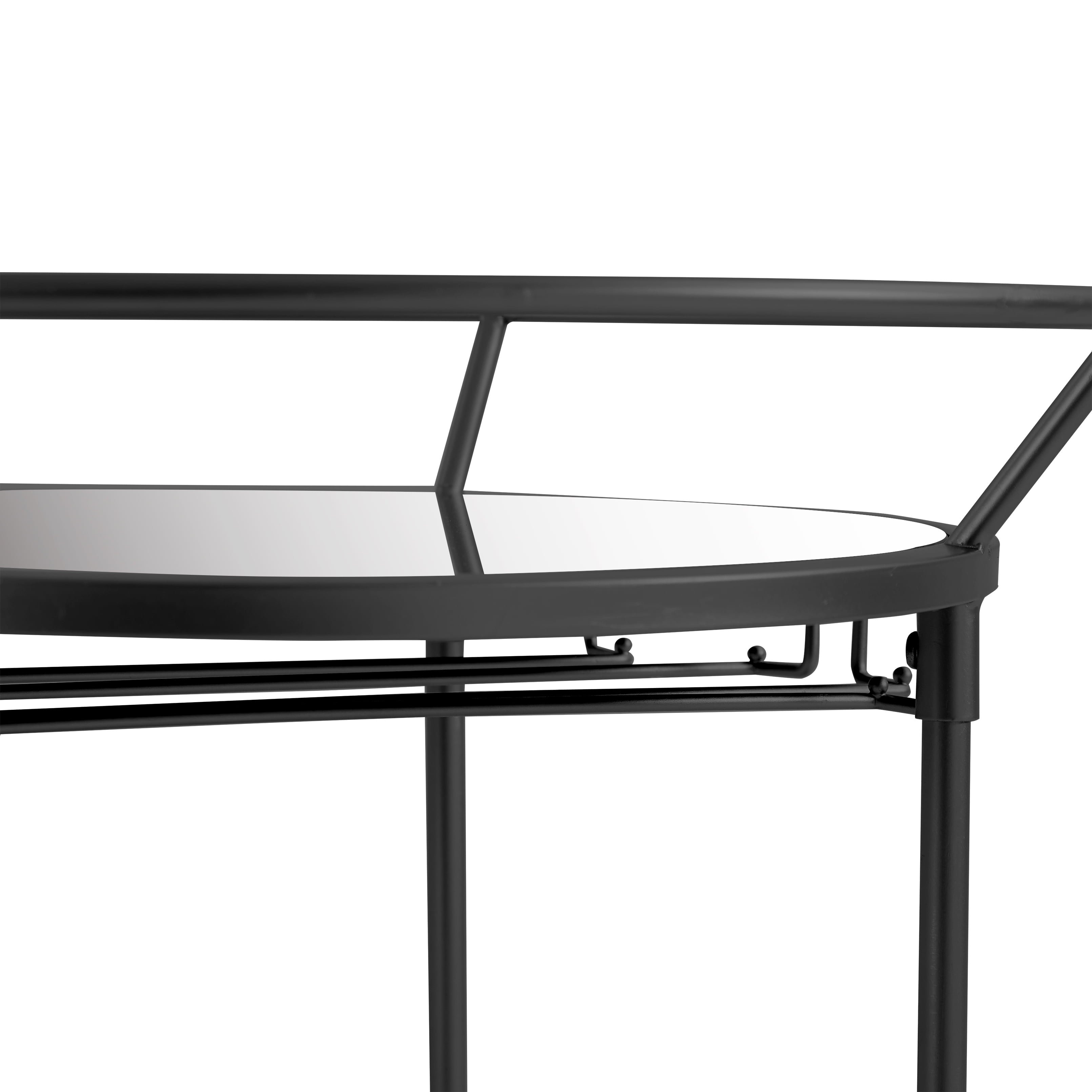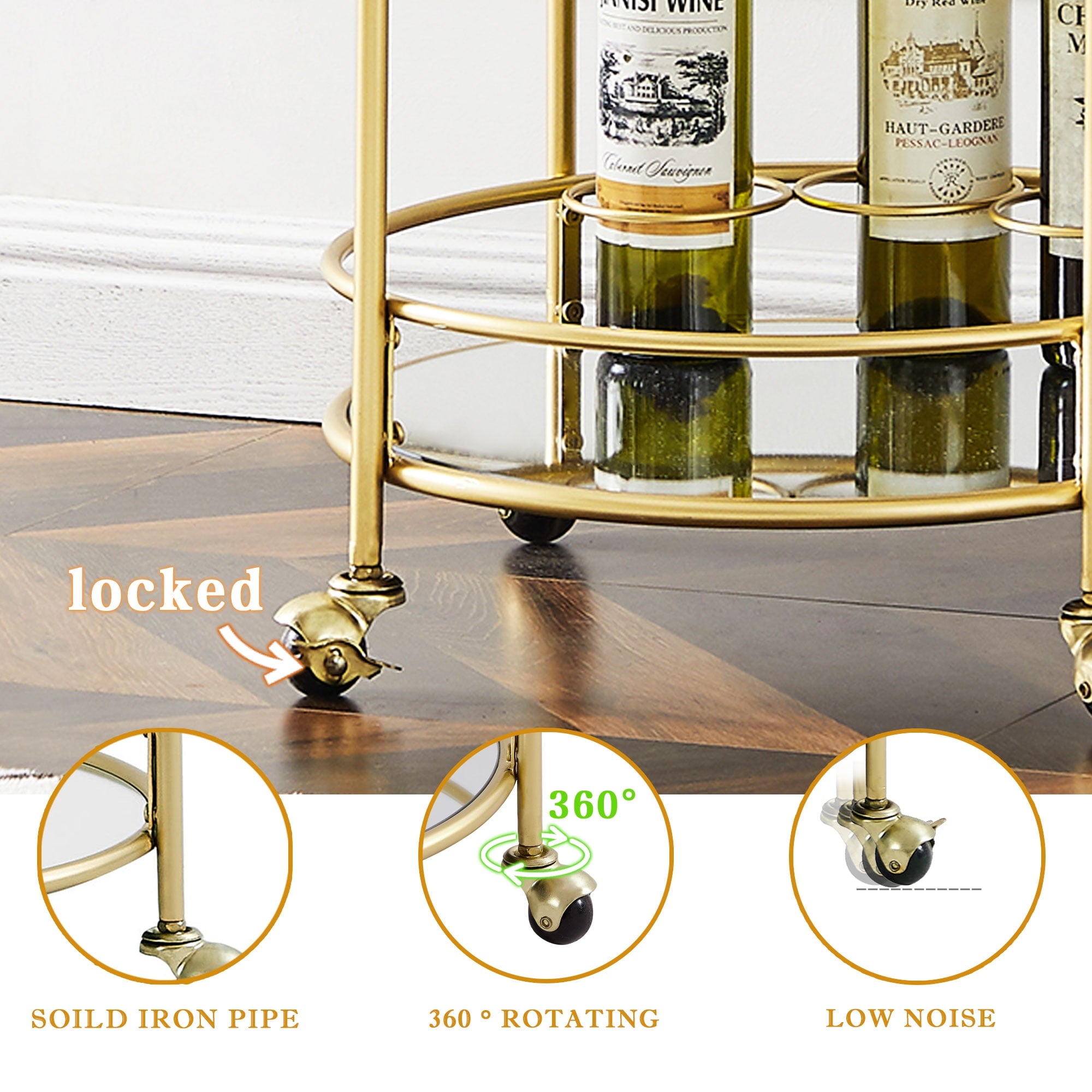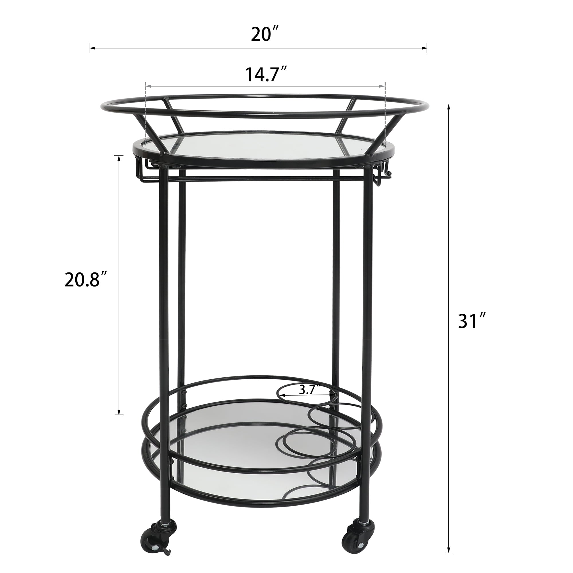 Come on! Make this exquisite and high-capacity mobile 2-tier black bar cart as a part of your family! Round shape with handle,4×360°spinner wheels(2 are lockable wheels),easy move or stop. Perfect for a modern or glamorous aesthetic, this functional yet stylish bar cart is also perfect for adding a touch of glamor to any aesthetic thanks to its clean lines and metallic finish. Sturdy metal frame with real mirror make it easy clean and long time use. Buy it now!