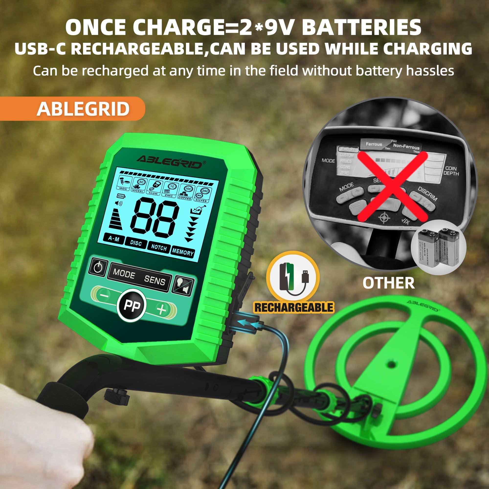 【RECHARGEABLE METAL DETECTOR 】Unlike other metal detectors, our detector can be recharged via a Type-C cable (included in the cardboard box), which lasts up to 5 hours on maximum power and can be fully charged in less than 2 hours. You can charge it using a portable power bank in outdoors. The built-in lithium-ion battery is extremely durable and will last for years, making it a very affordable option.