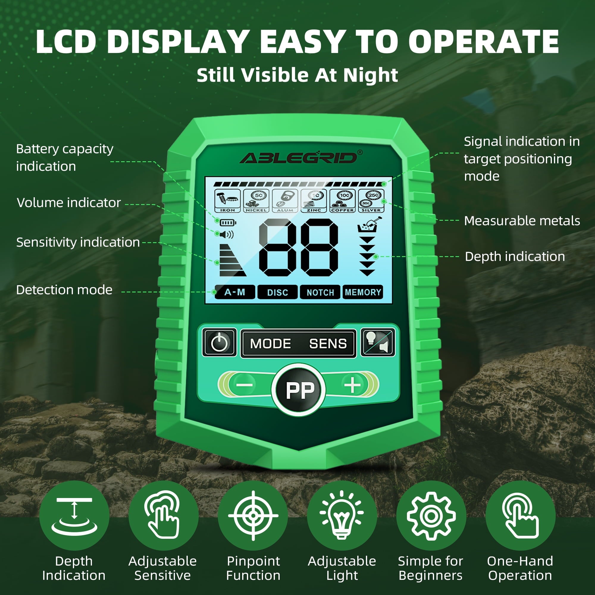 【INTUITIVE LARGE LCD DISPLAY】User-friendly interface specifically developed and designed for beginners. The backlight function enables easy treasure hunting in low light or nighttime conditions. The silicone buttons, designed for easy operation, provide satisfying tactile feedback and sensitivity, offering greater flexibility. It’s convenient for you to get the type of metal target, depth, recognition, sensitivity level, operating mode, which let you detecting more efficient.