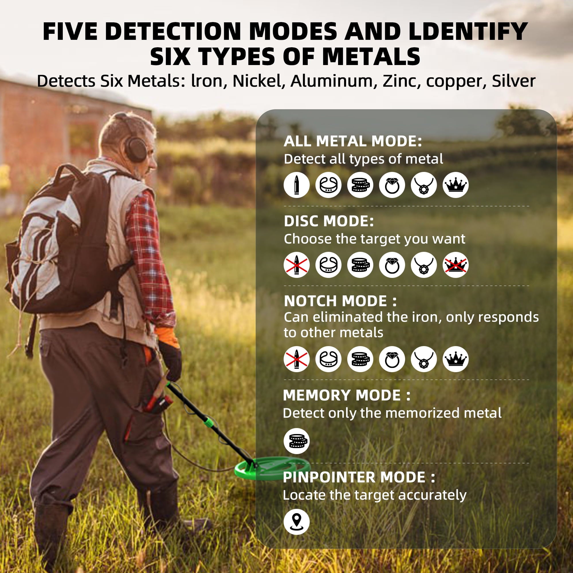 - 5 DETECTOR MODES: Five Detector Modes Including All Metal, Discrimination, Notch, Memory and Pinpoint.