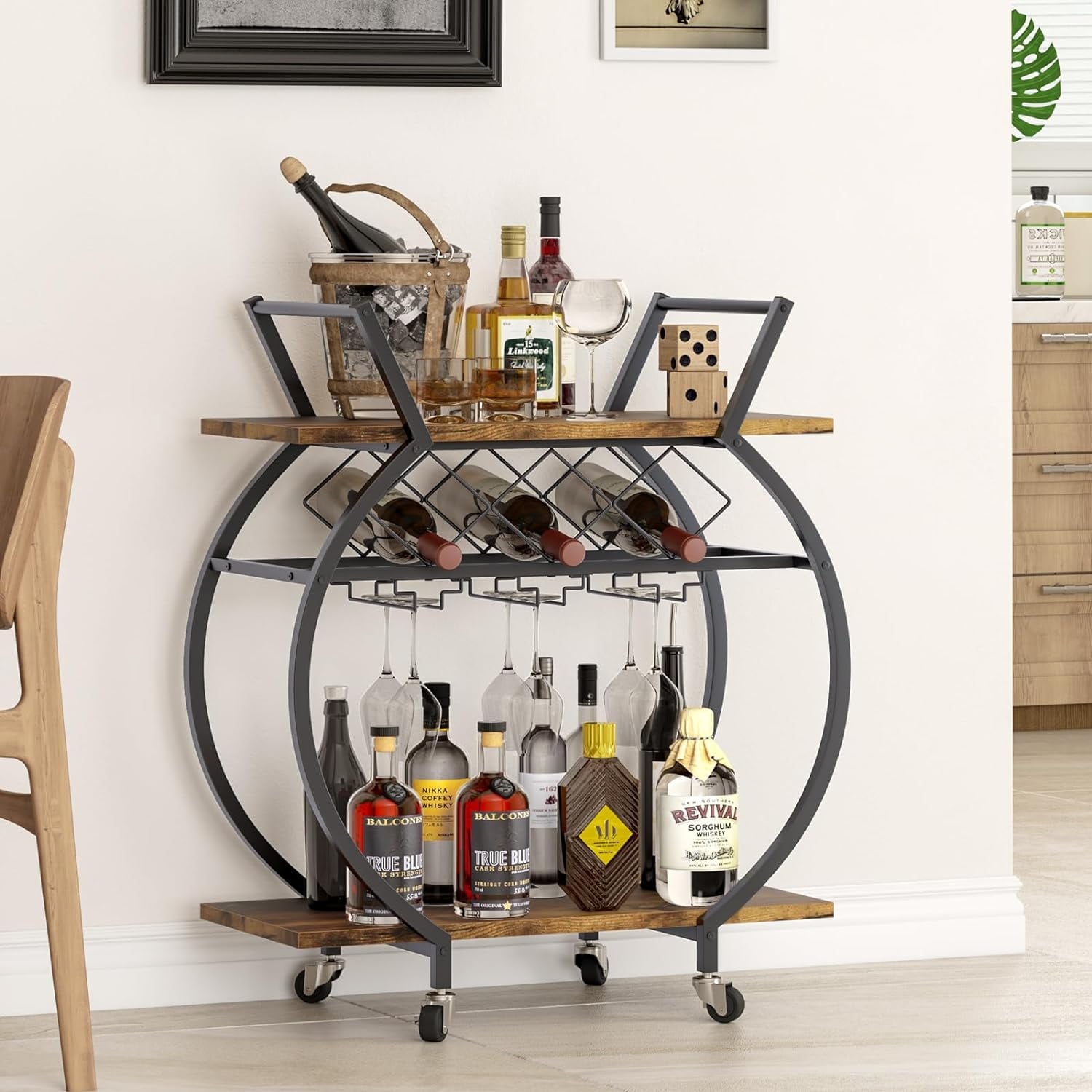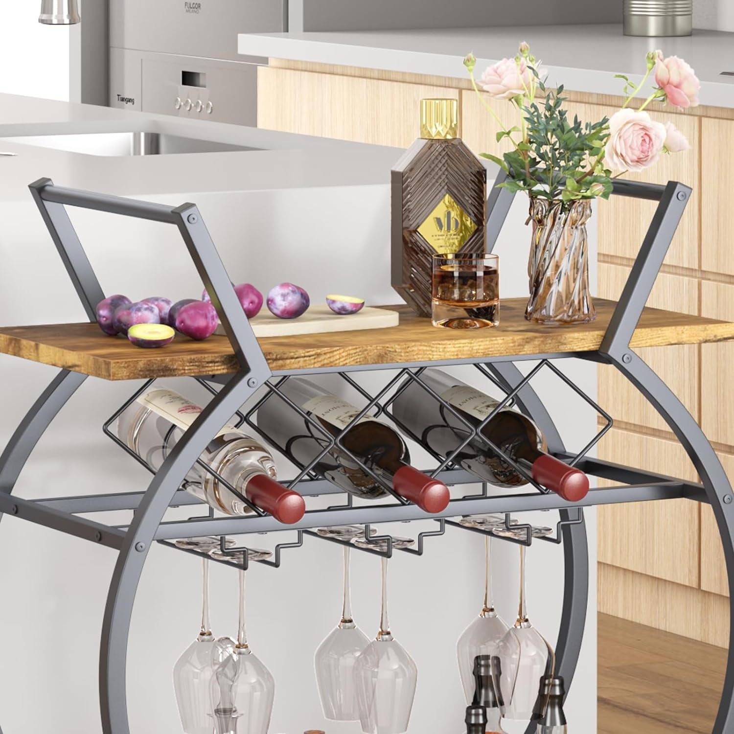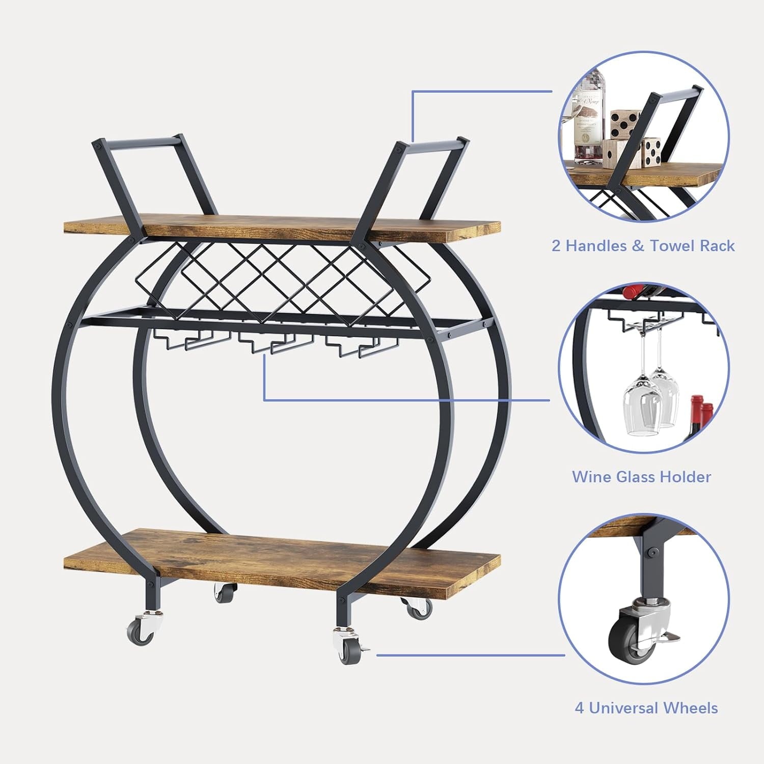 - 【MORE DETAILS】This wine cart is equipped with two modern metal handles that allow you to push in all directions. In addition, this metal handle can also be used to hang towels, suitable for various occasions.