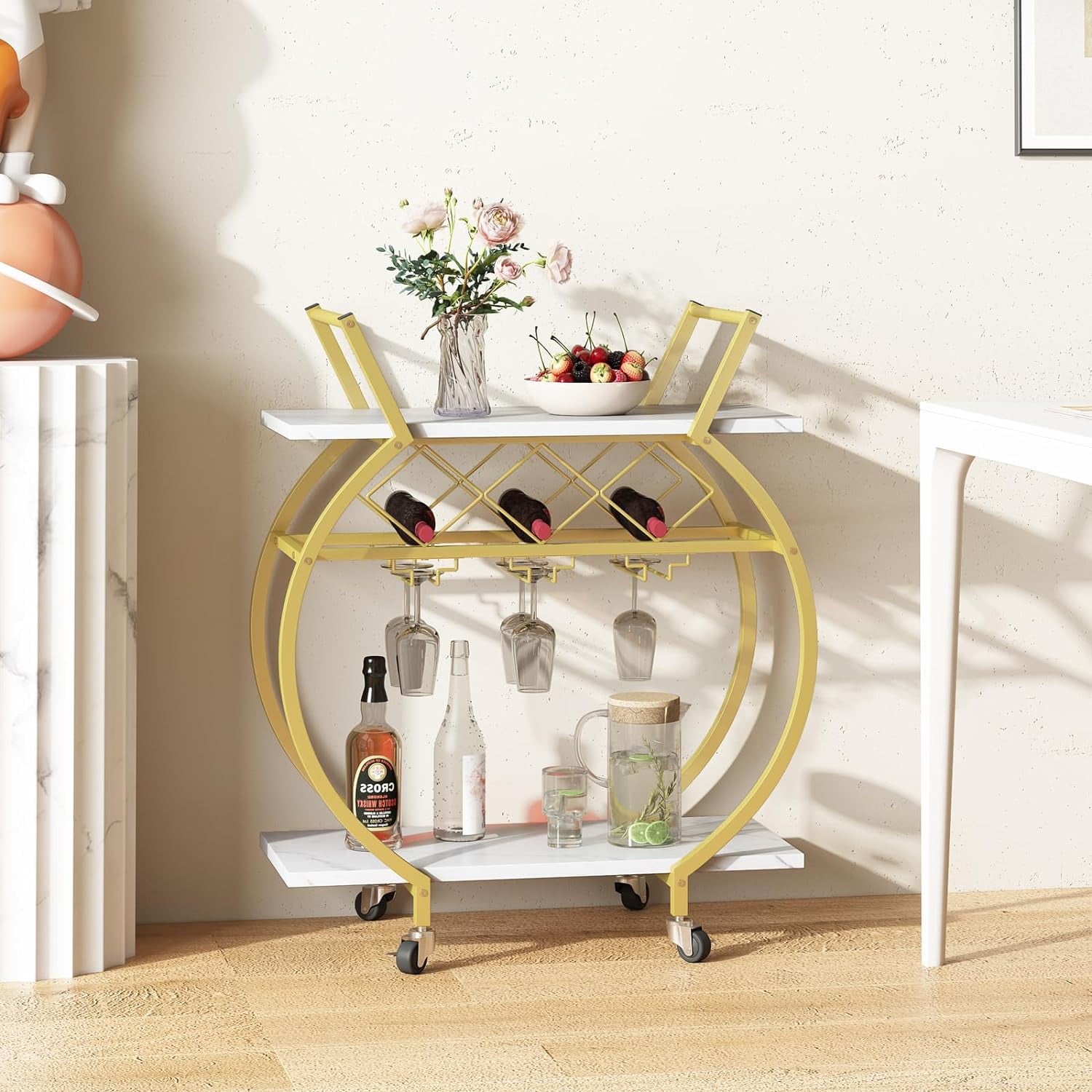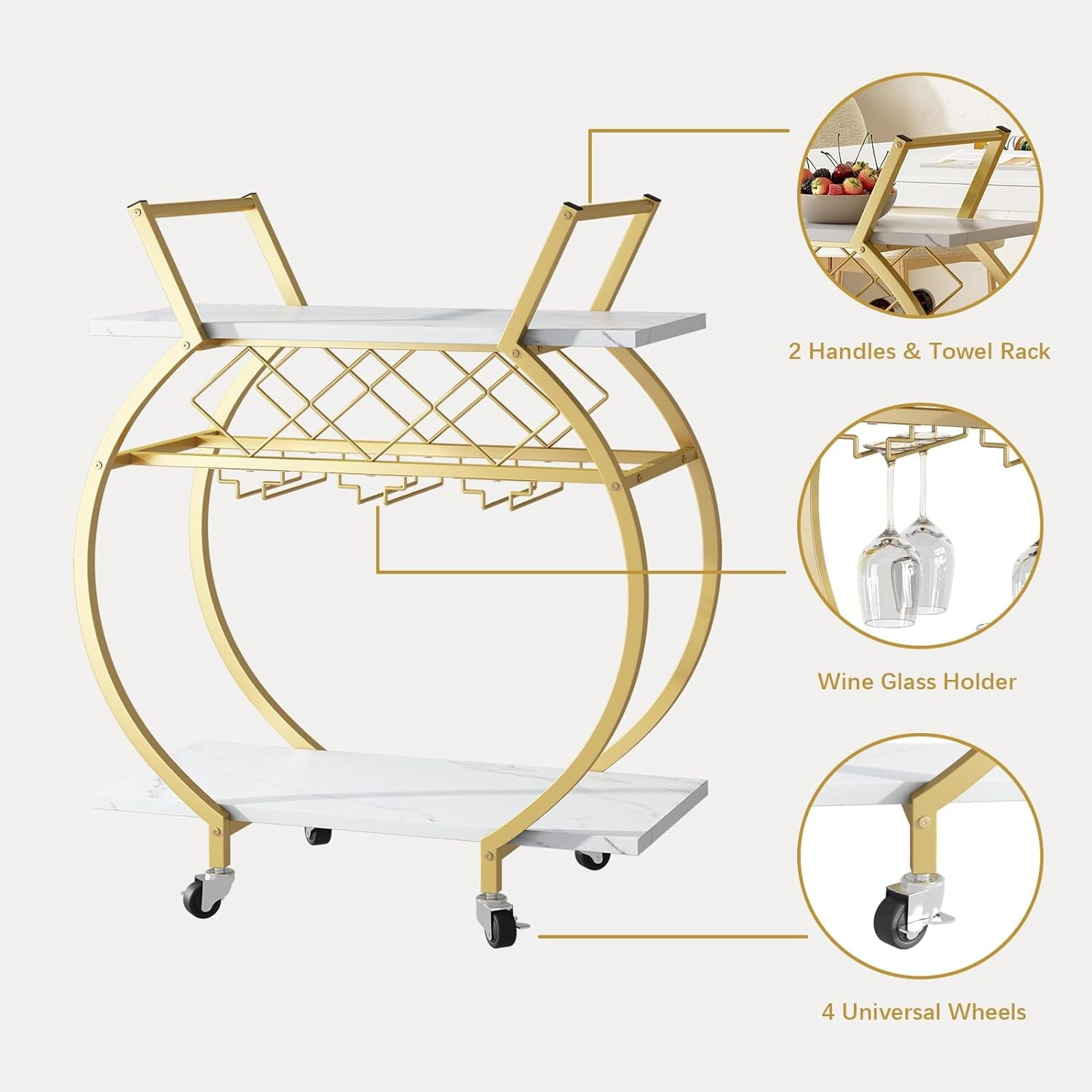 - 【MULTI FUNCTION】This golden bar cart can not only serve as a kitchen service cart, microwave rack cart, beverage cart at parties, but also serve as a wine cart or coffee cart for hotels. With its convenient and versatile design, this mobile tool car will be a good assistant for various gatherings and household storage.