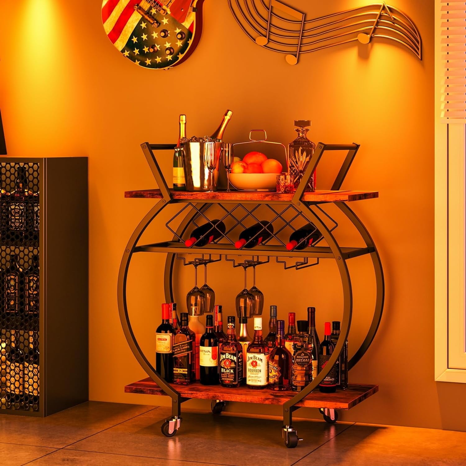 - 【BEAUTIFUL & DURABLE】The Azheruol bar car has a curved black frame design, and the storage layer is made up of vintage wood grain board showcases an elegant and noble sense of modernity.