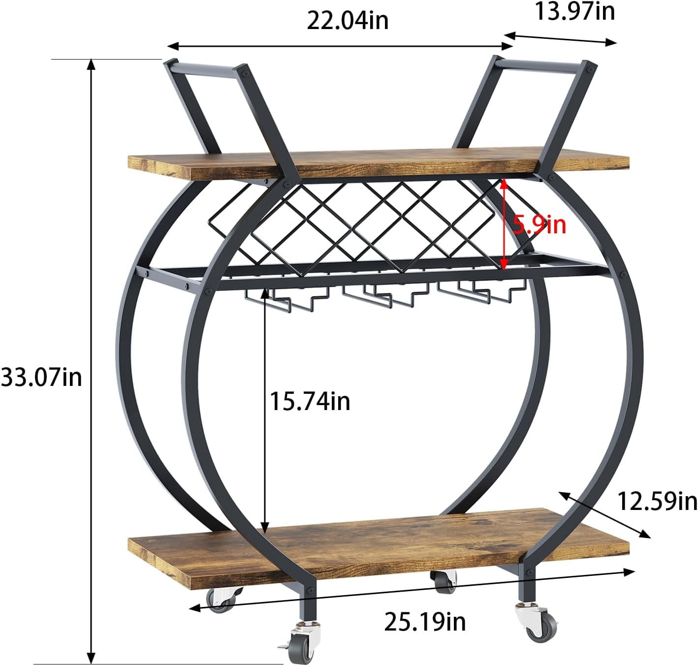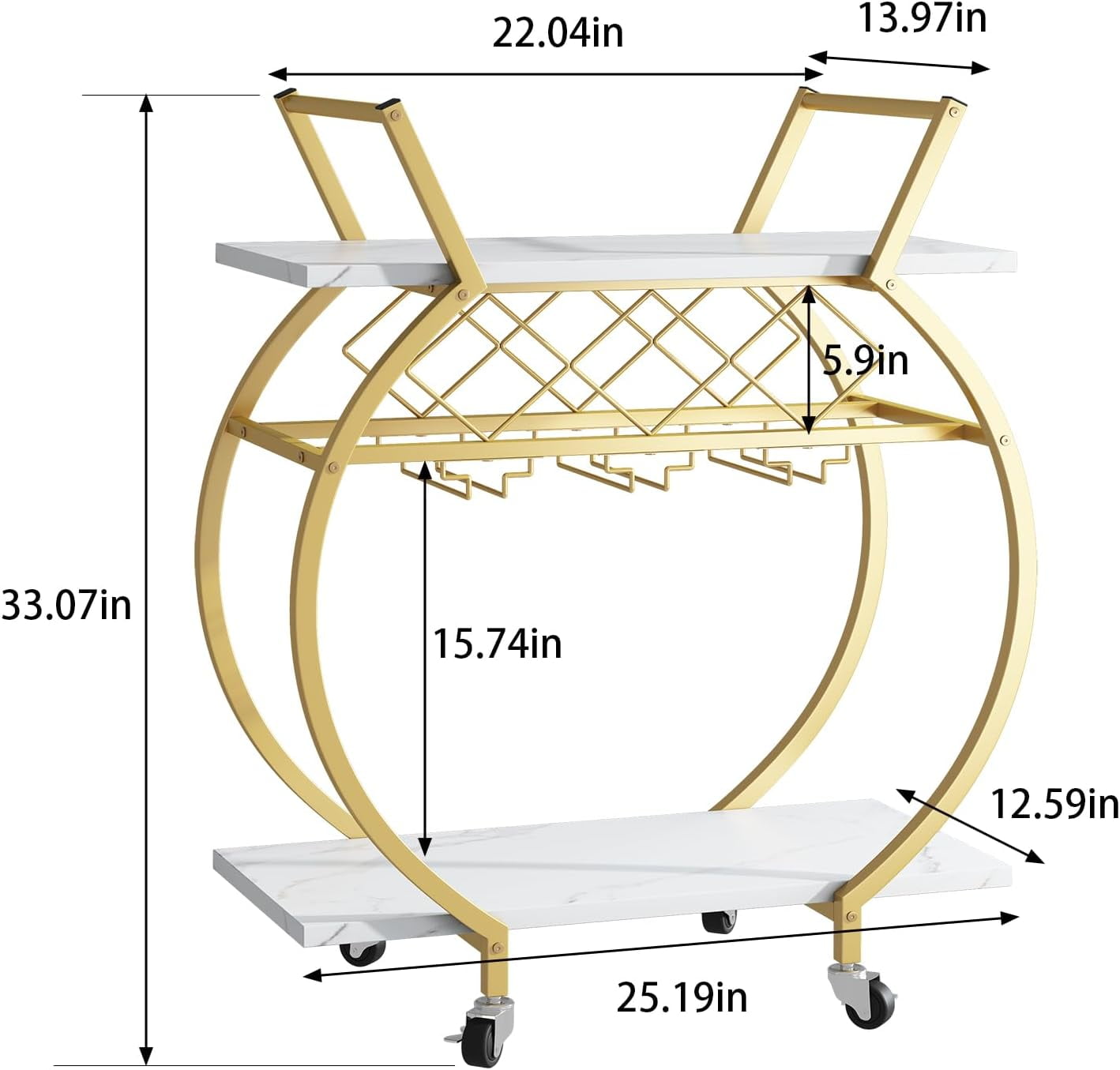 - 【LARGE CAPACITY】The Bar cart measures 25.2*13.98*32.87 inches and has 2 tiers of open display storage shelf. You can put things like wine, snacks, fruit, coffee,cutlery, etc.At the bottom of the first floor, we have added a wine rack that can hold three bottles horizontally and hang up to six wine glasses to meet your needs.