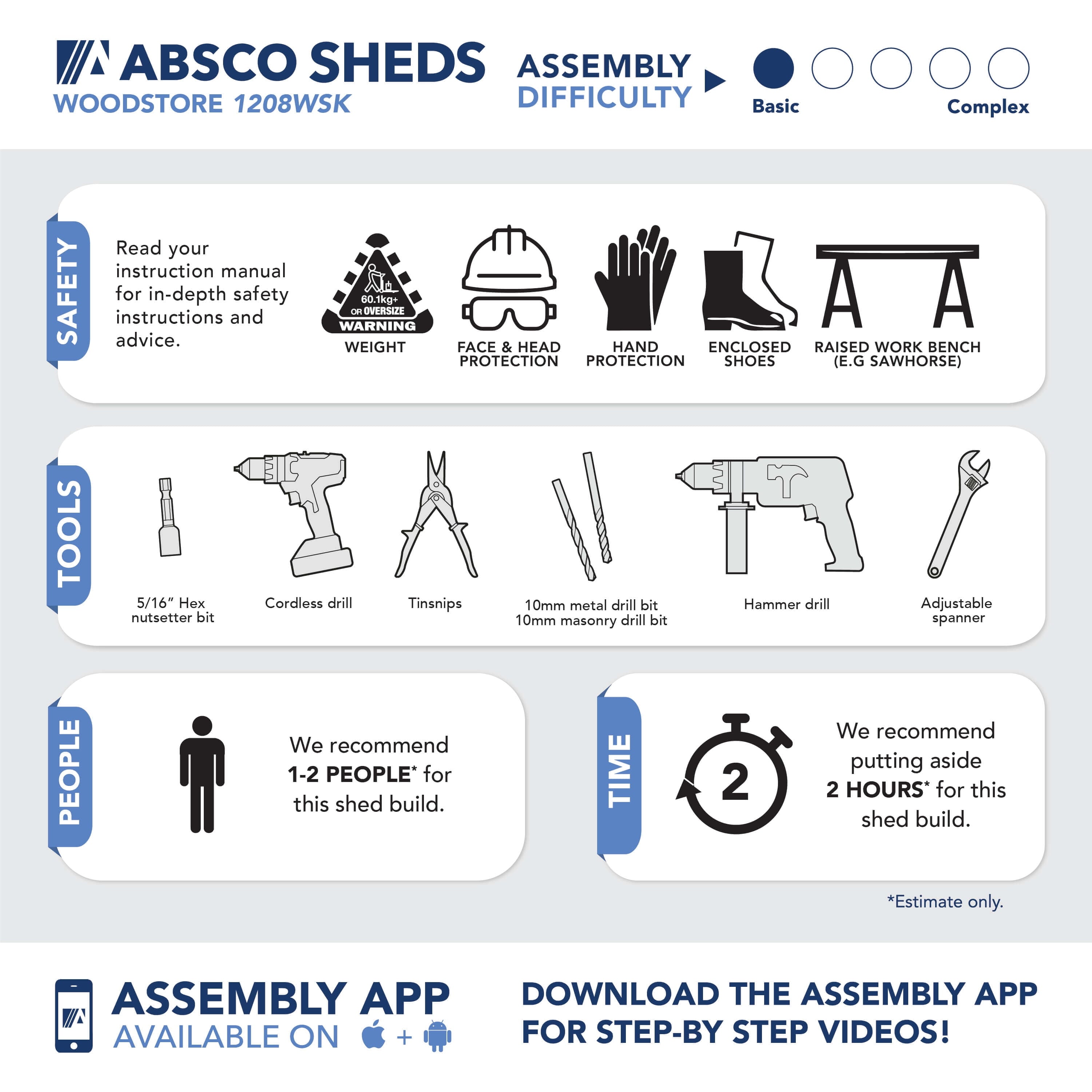 - DIY kit that requires assembly. Please allow 1 day to assemble the shed and 2 people may be required. Step-by-step assembly videos and instruction manuals are available through the Absco Sheds App