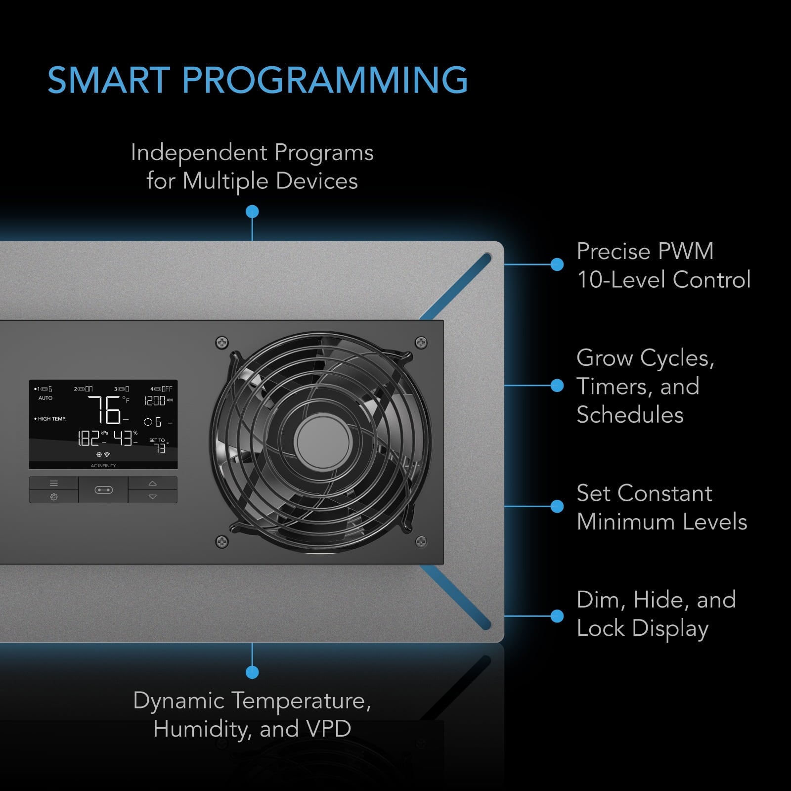 - Dynamic temperature, humidity & VPD programming, with timers, cycles, scheduling, and minimum speed.