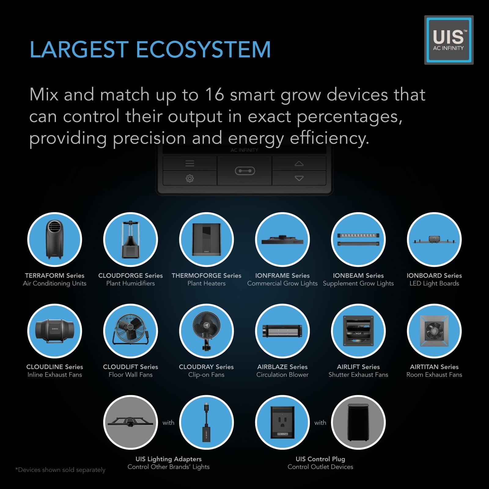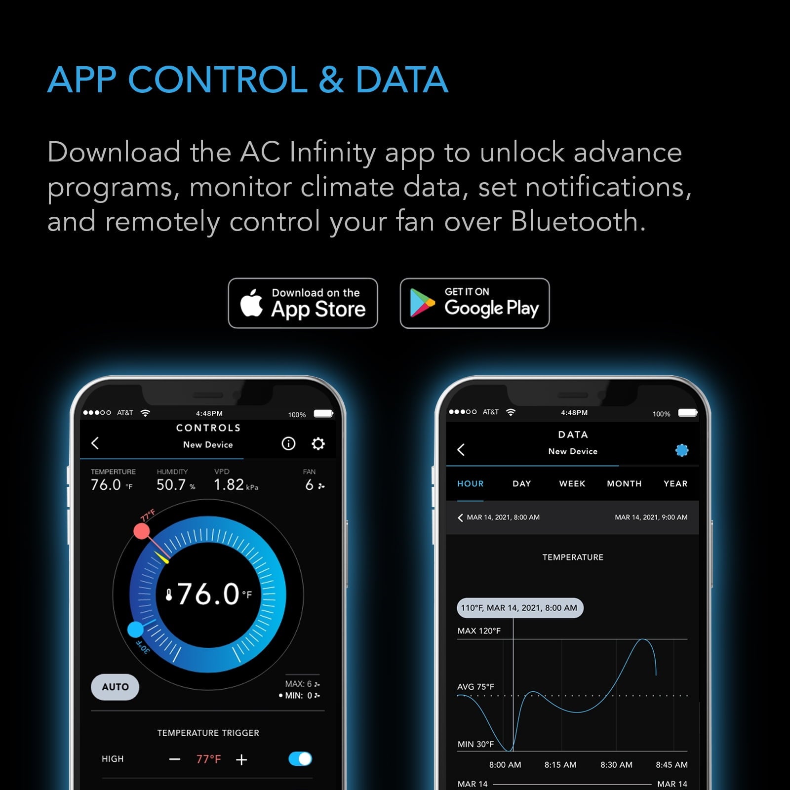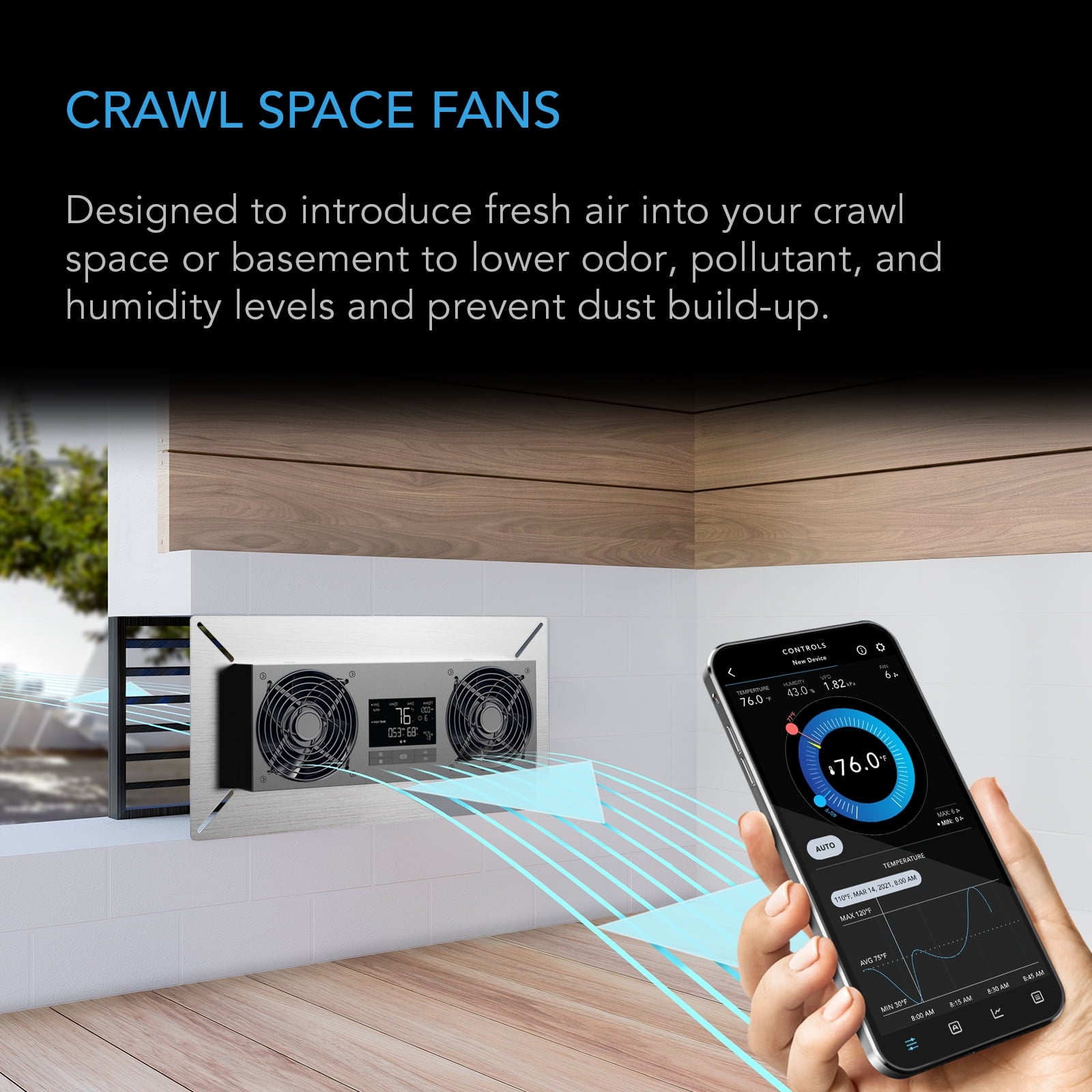 The onboard controller features smart programming to keep temperature, humidity, and VPD in check to produce the optimal environment. Set dynamic programs that go beyond on/off triggering and adjust fan speed in response to changing indoor climate. Minimum baseline levels keep the crawlspace fan run-ning at low speeds for consistent airflow, while timer, cycle, and schedule modes add custom on-demand activation. Securely connect to the AC Infinity app via WiFi or Bluetooth to utilize automation capabilities from anywhere throughout the day. Remotely access your devices, unlock advance pro-grams, set alarms and notifications, view historical charts, and export CSV data.