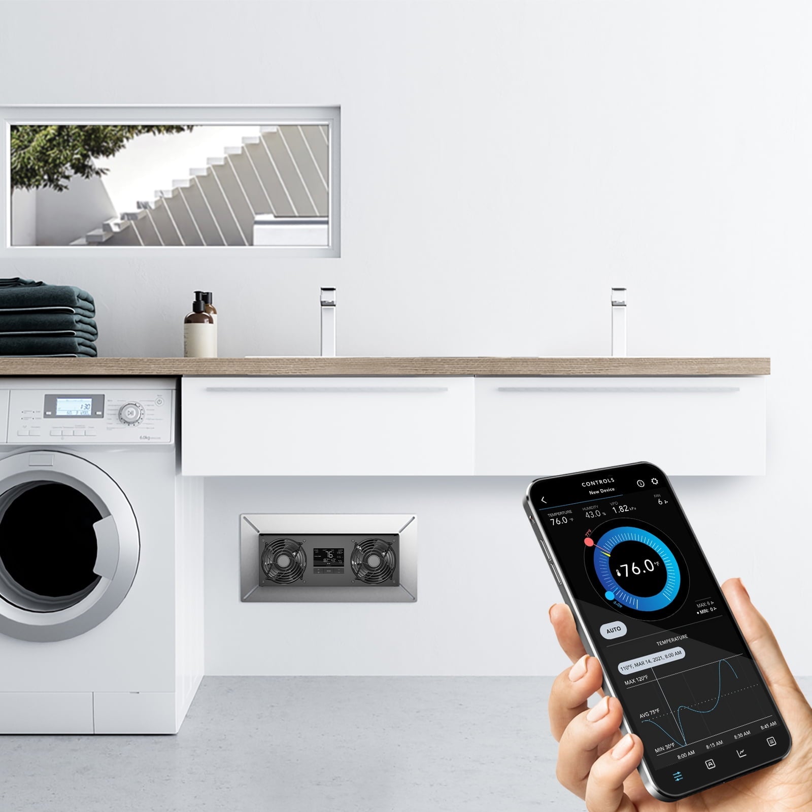A high-airflow ventilator fan designed to control the temperature and humidity levels of your crawlspace, basement, attic, and garage. This system reduces humidity levels while expelling odors and stale air from your home. Features a WiFi-enabled LCD with smart thermostat and dehumidistat control, as well triggers, fan speed control, status alerts, and more. Included 12 ft. corded sensor probe plugs into the controller to provide temperature and humidity readings. The heavy-duty build includes a stainless-steel mounting frame and IP-55-rated fans. Features dual 120mm PWM-controlled DC fans that are highly efficient in maximizing airflow at lower noise and power levels.
