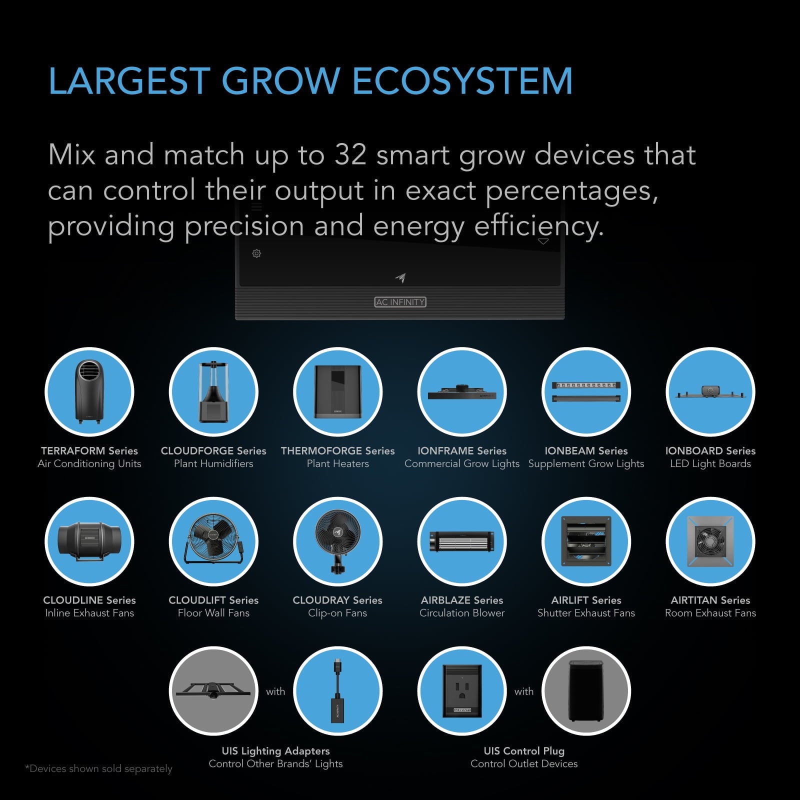 - Mix and match up to 32 devices from the largest platform of smart fans, grow lights, humidifiers, heaters, A/Cs, and grow lights & outlet devices from other brands.
