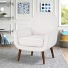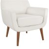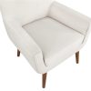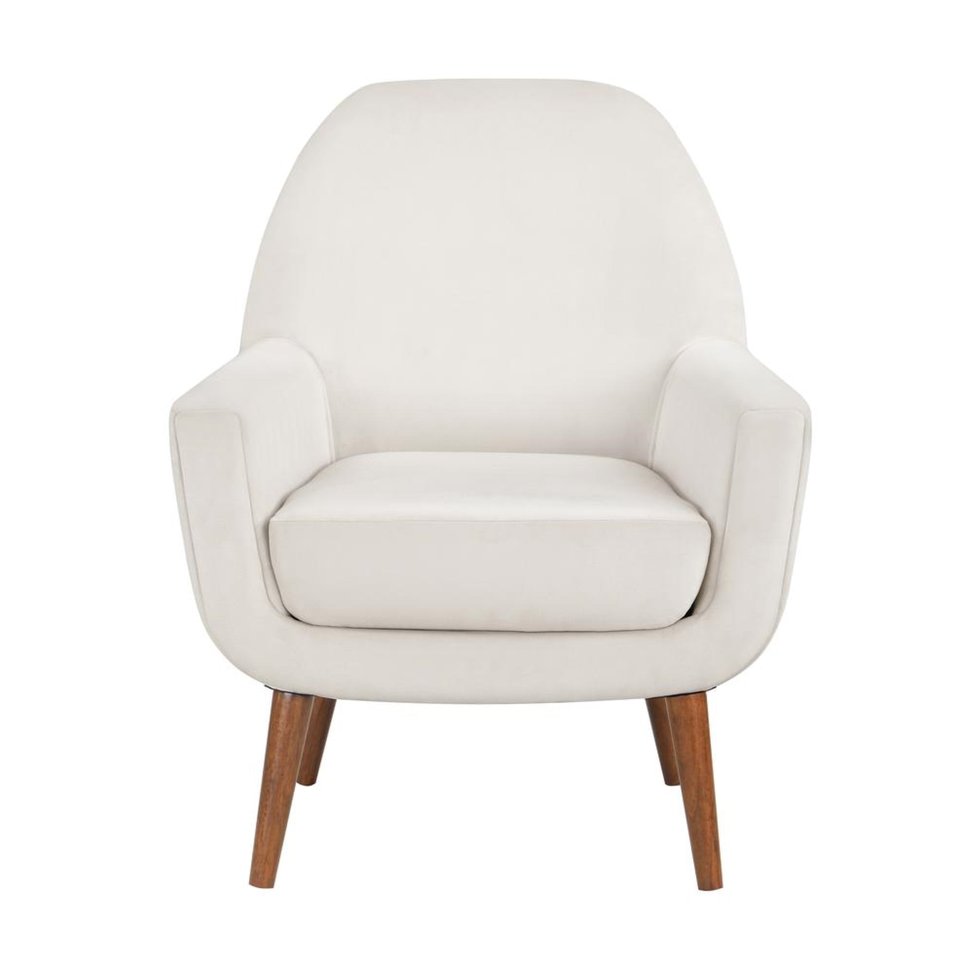 The Accera accent chair offers vintage charm with sleek arms and Italian mid-century look. The trendy plush Sea Oat Cream velvet upholstery wraps you in comfort while the round solid wood legs add interesting contrast to the gentle curves of the front and back. The seat cushion is very comfortable and the chair is accented by brown walnut color legs.