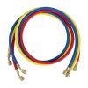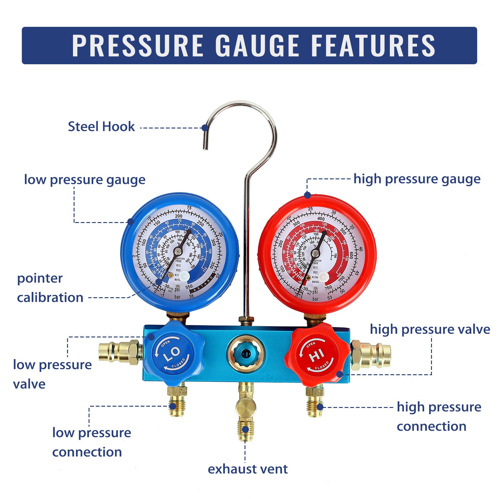 And the three color-coded hoses are easy for you to identify the high pressure side (Red), low pressure side (Blue) and filling hose (Yellow), perfect for R12/R22/R134a/R410a/R502 refrigerant refrigeration systems.