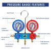 - –[Durable Flexible Hoses]: Our AC Manifold Gauge Set Kit comes with color-coded rubber hoses to easily identify the high-pressure (red), low-pressure (blue), and filling hose (yellow). Crafted for durability and flexibility, these hoses ensure long-term reliability and resistance to damage.