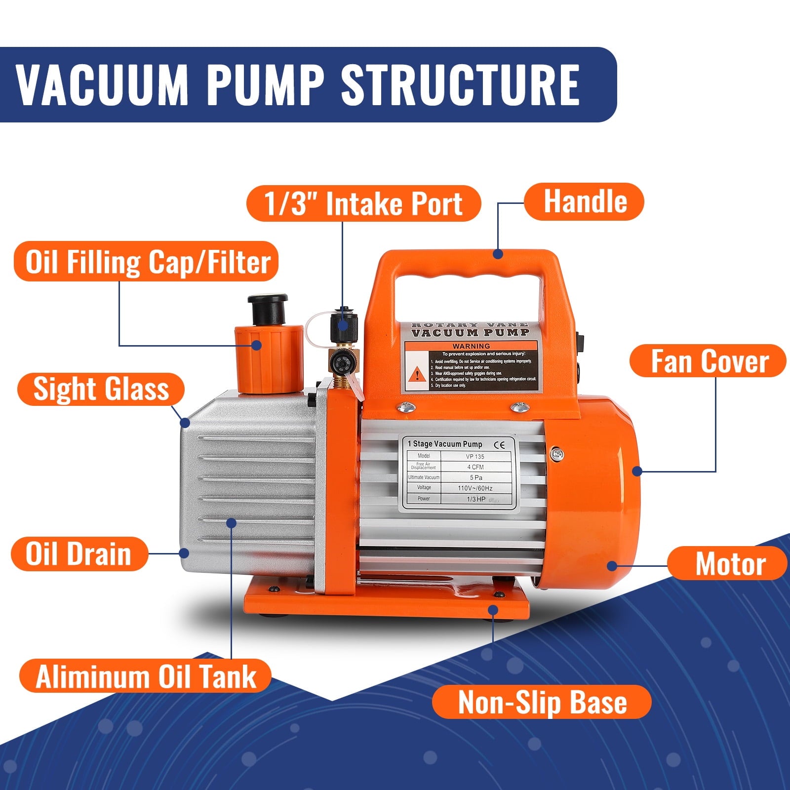 - –[Easy Monitoring Maintenance]: Designed for convenience, our HVAC Vacuum Pump includes an oil sight glass for easy monitoring of oil levels and quality, alongside a drain for quick and thorough oil changes. Enjoy hassle-free operation and maintenance with these considerate features.