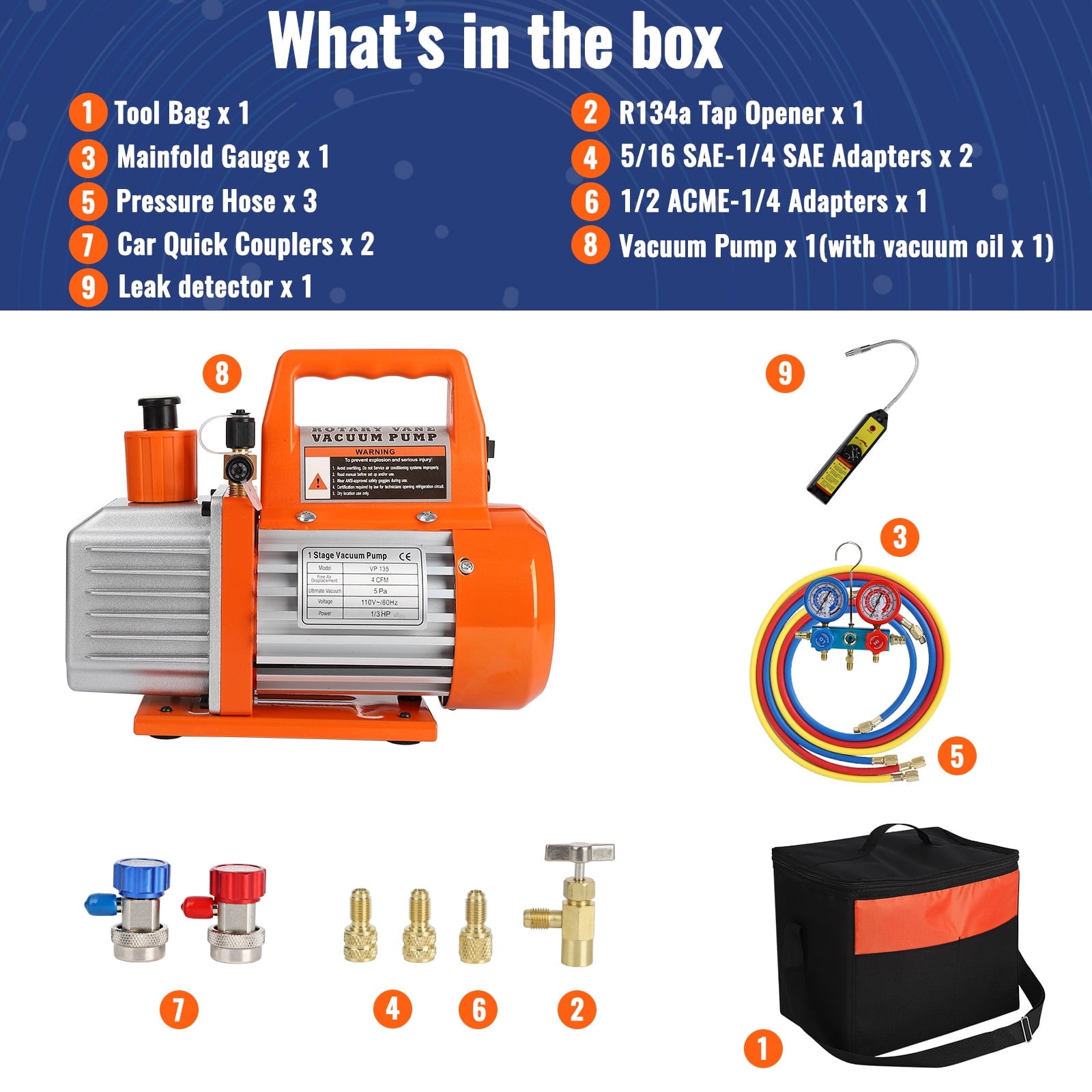 - –[Complete Kit for AC Maintenance]: This comprehensive kit includes a powerful vacuum pump and a manifold gauge set, equipped with a leak detector and carry bag. Ideal for AC air conditioning refrigeration recharging, it offers everything needed for efficient and effective HVAC maintenance.