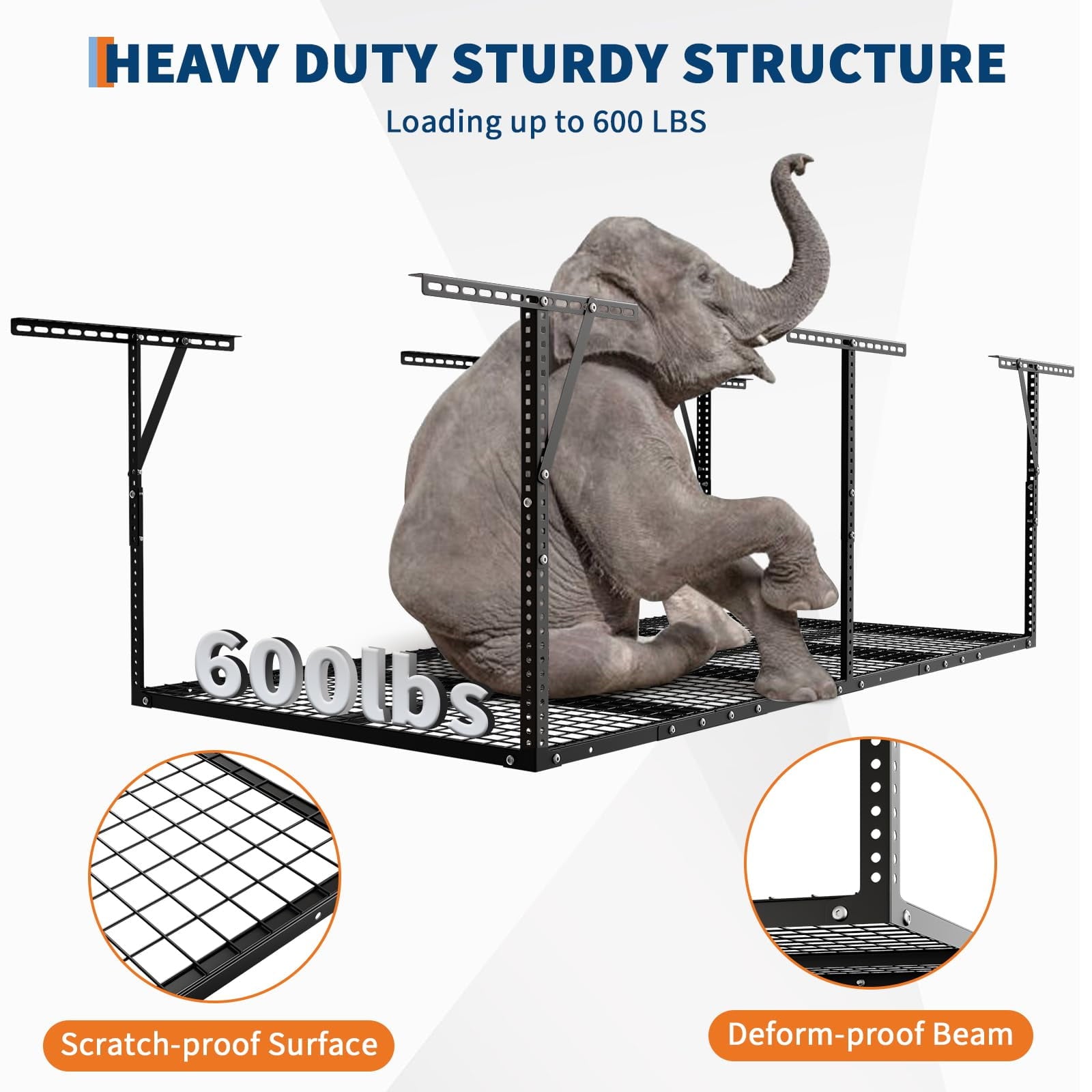 - Large Storage Capacity:The overhead garage storage rack offers a maximum storage capacity of 105 Cu.F.It’s ideal for storing bikes, construction tools, storage bins, holiday decorations, and various other items and accessories.