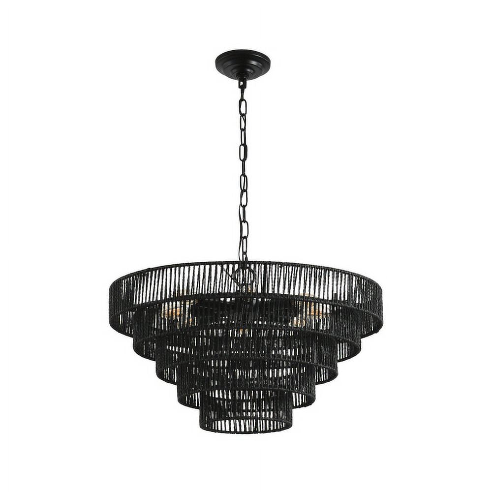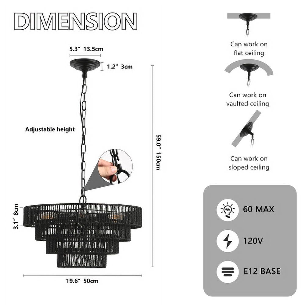 ACE-LIGHTS,Rustic 4-Tier Height Adjustable Hemp Rope Chandelier with 6*E12 Sockets(Bulb Not Included),UL Listed Hardwired Pendant Light,Handmade Tiered Boho Ceiling Light Fixture for Living,Dining Room,Kitchen,Foyer(Black)