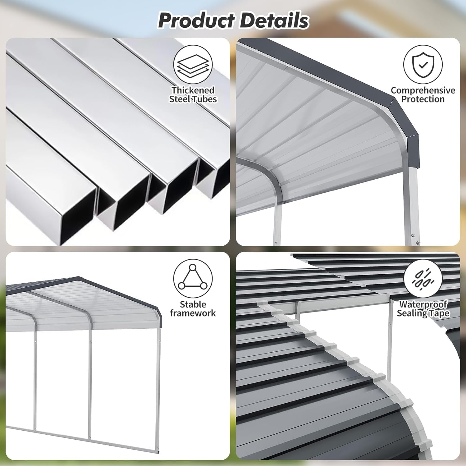 - Durable Design:The upgraded galvanized steel roof is fixed with expansion screws, which is windproof, rainproof and rust-resistant, adaptable to various bad weather conditions, and fully protects the safety of the vehicle.