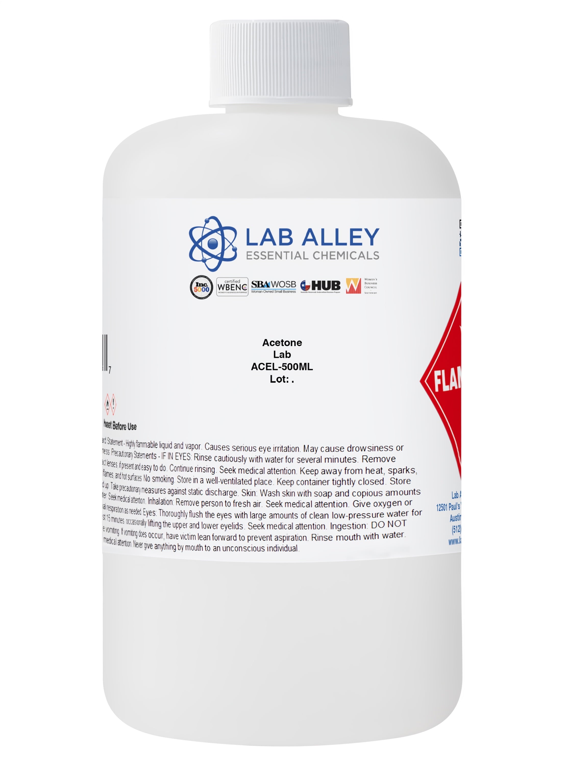 Lab Alley sells only the highest quality acetone and are the reliable choice for lab grade acetone. This product is in stock in multiple sizes ranging from 500 mL to 55 gallons, and by the pallet, all available for quick shipping. Orders are usually shipped in 24-48 hours.